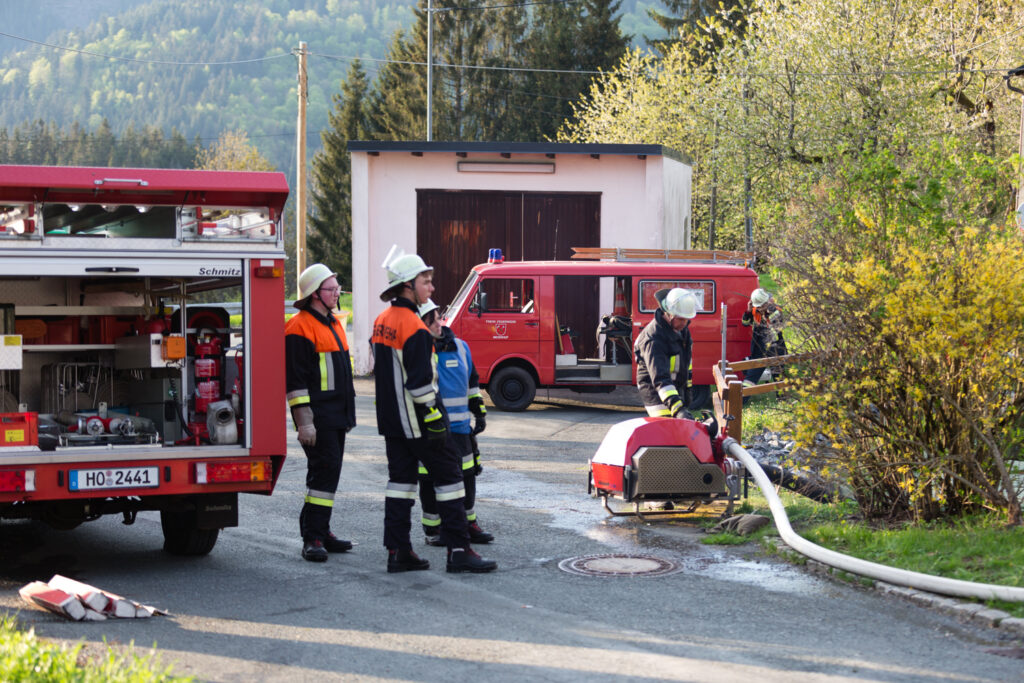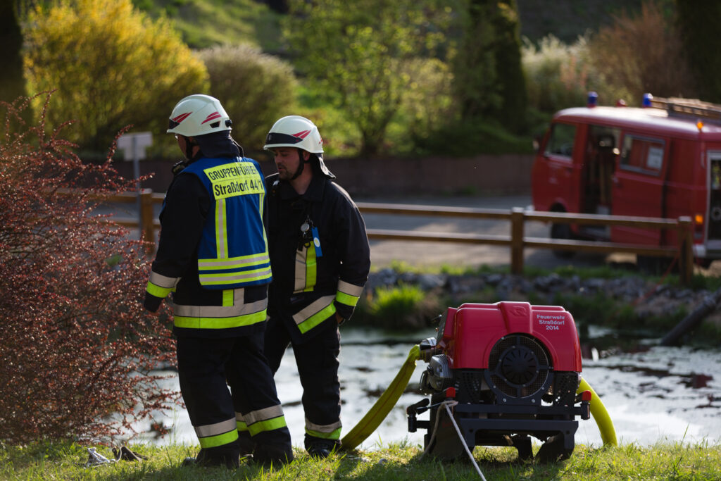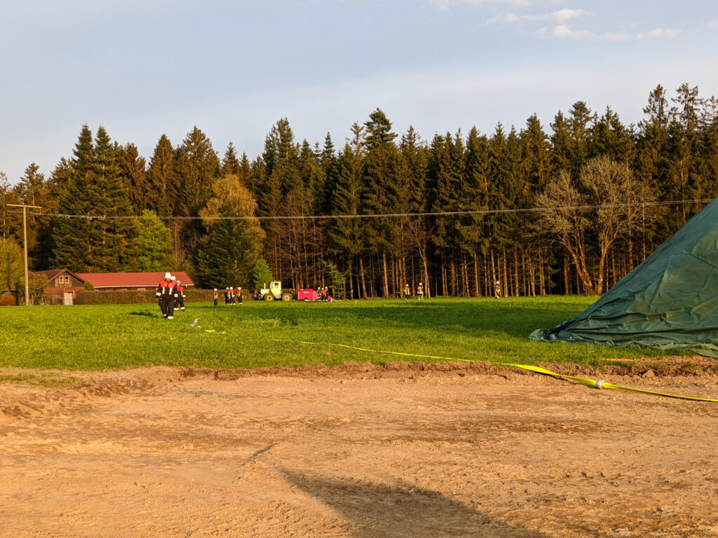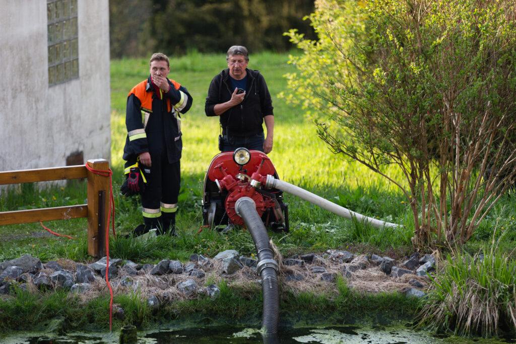 Ein direkt angrenzender Teich stellte eine ausreichende Löschwasserversorgung über drei Tragkraftspritzen sicher. Da der Hydrant zu wenig Druck bereitstellte, wurde vorsorglich zusätzlich noch eine lange Schlauchleitung gelegt, die dann jedoch nicht mehr benötigt wurde.
