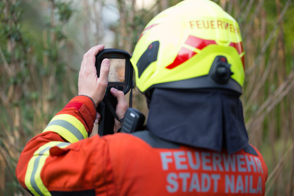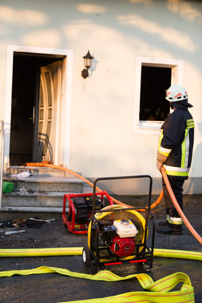 Nachdem das Feuer gelöscht war, wurden zwei Überdruckbelüfter zur Entrauchung an der Haustür in Stellung gebracht. Im Inneren wurde die völlig zerstörte Einrichtung und die Zwischendecken mit der Wärmebildkamera auf Glutnester abgesucht.