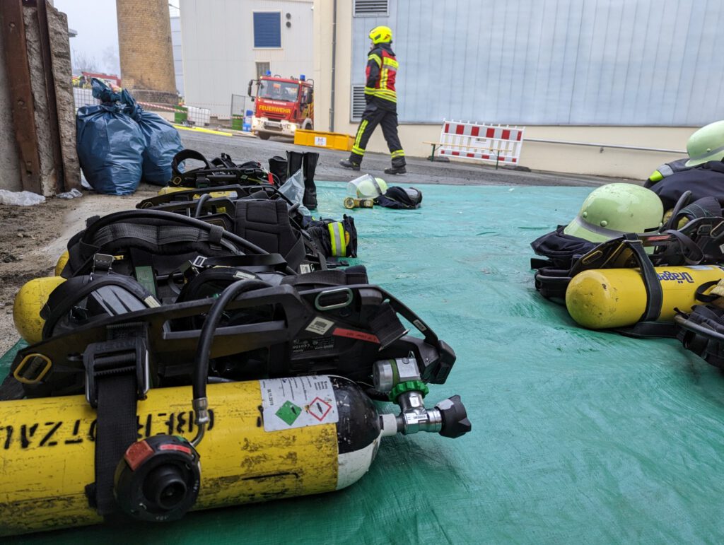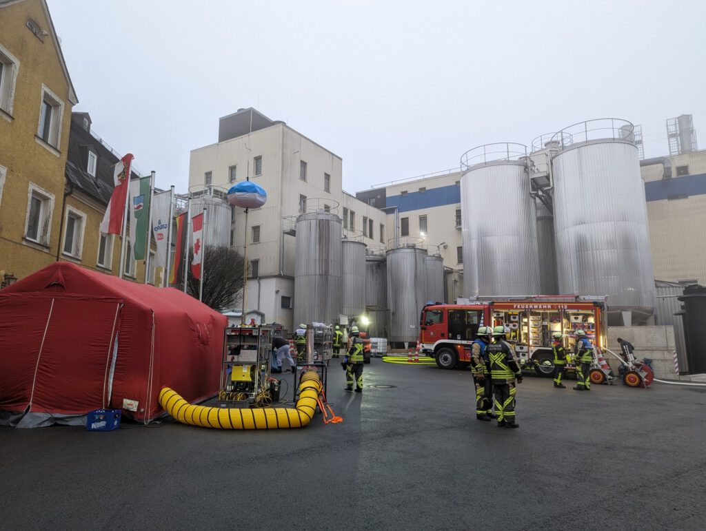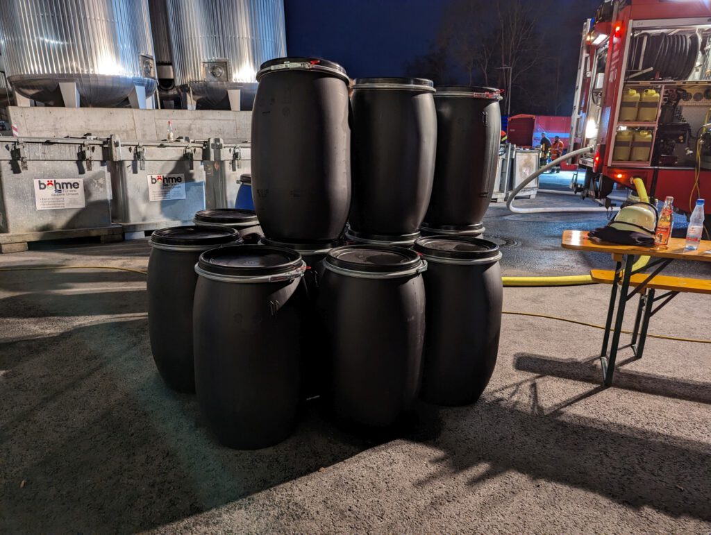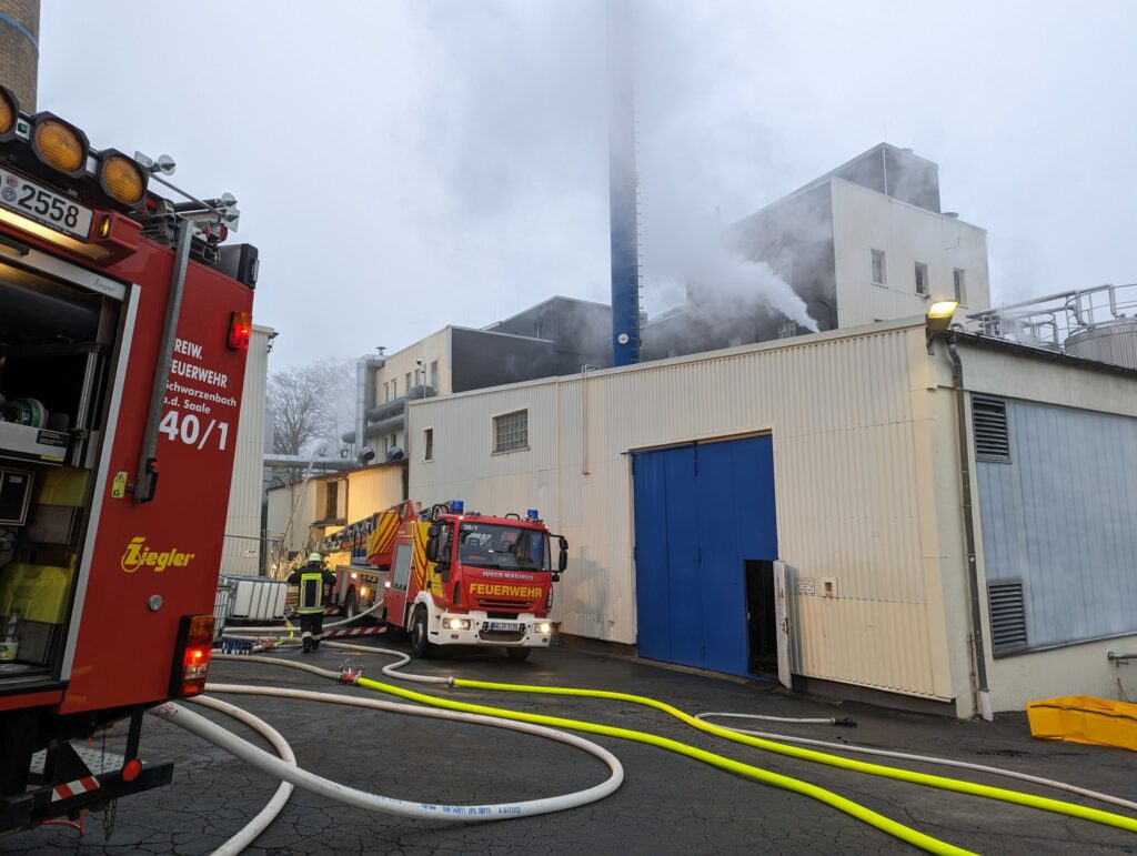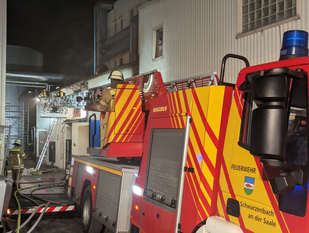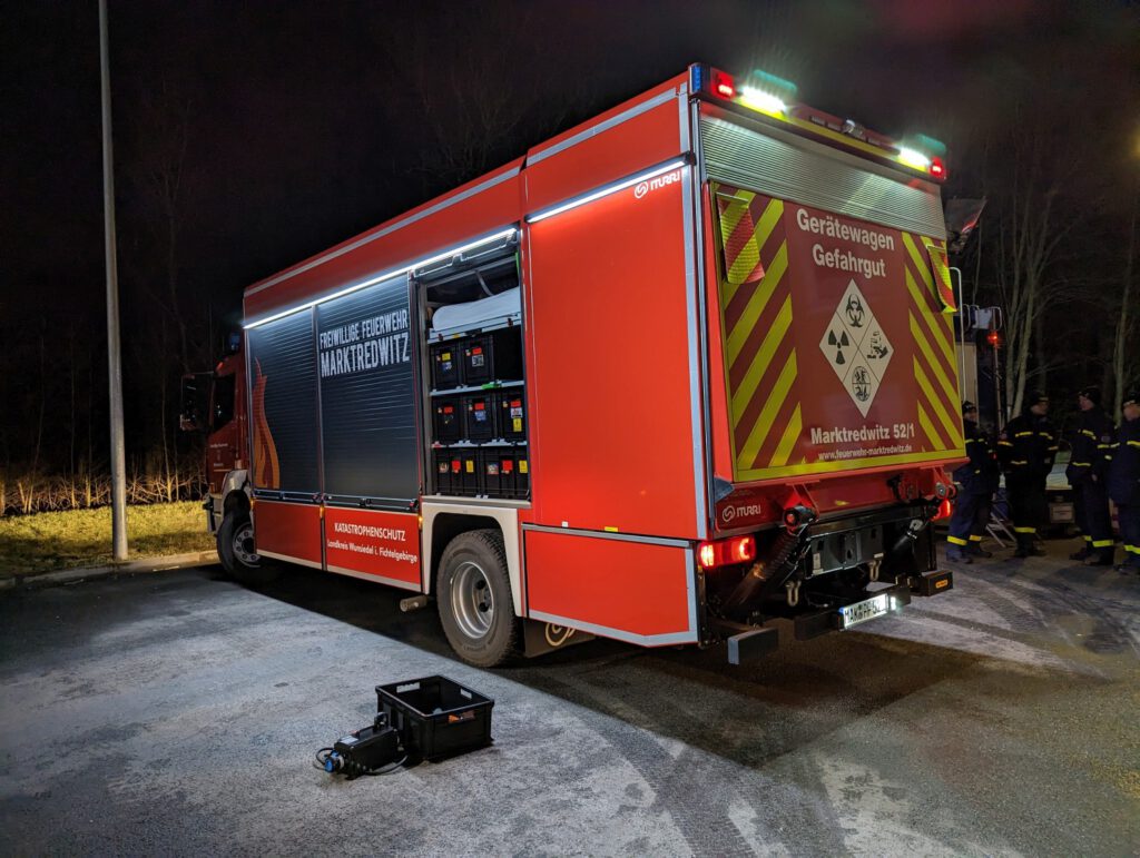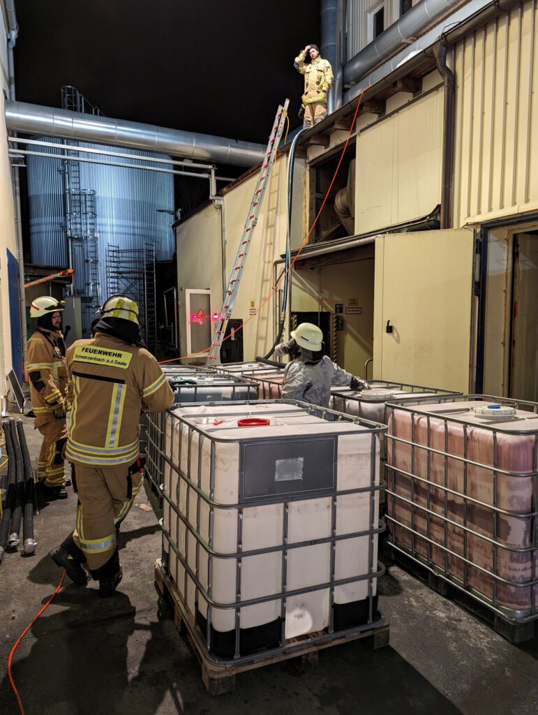 Die Feuerwehren wurden am 03.03.2023 um 04:18 Uhr wegen einer ausgelösten Brandmeldeanlage in einer Firma in Schwarzenbach an der Saale alarmiert. Beim Eintreffen teilten Mitarbeiter mit, es käme Rauch aus einem Kesselhaus. Ein Trupp ging unter Atemschutz zur Erkundung vor. Nachdem im Kesselhaus kein Brand festgestellt werden konnte, arbeitete man sich in die angrenzenden Räumen vor, wo schließlich eine brennende Maschine vorgefunden wurde. In dem Raum befanden sich außerdem mehrere 1000 Liter IBC-Behälter mit Gefahrenstoffen, von denen einer durch den Brand bereits stark beschädigt und ausgelaufen war.