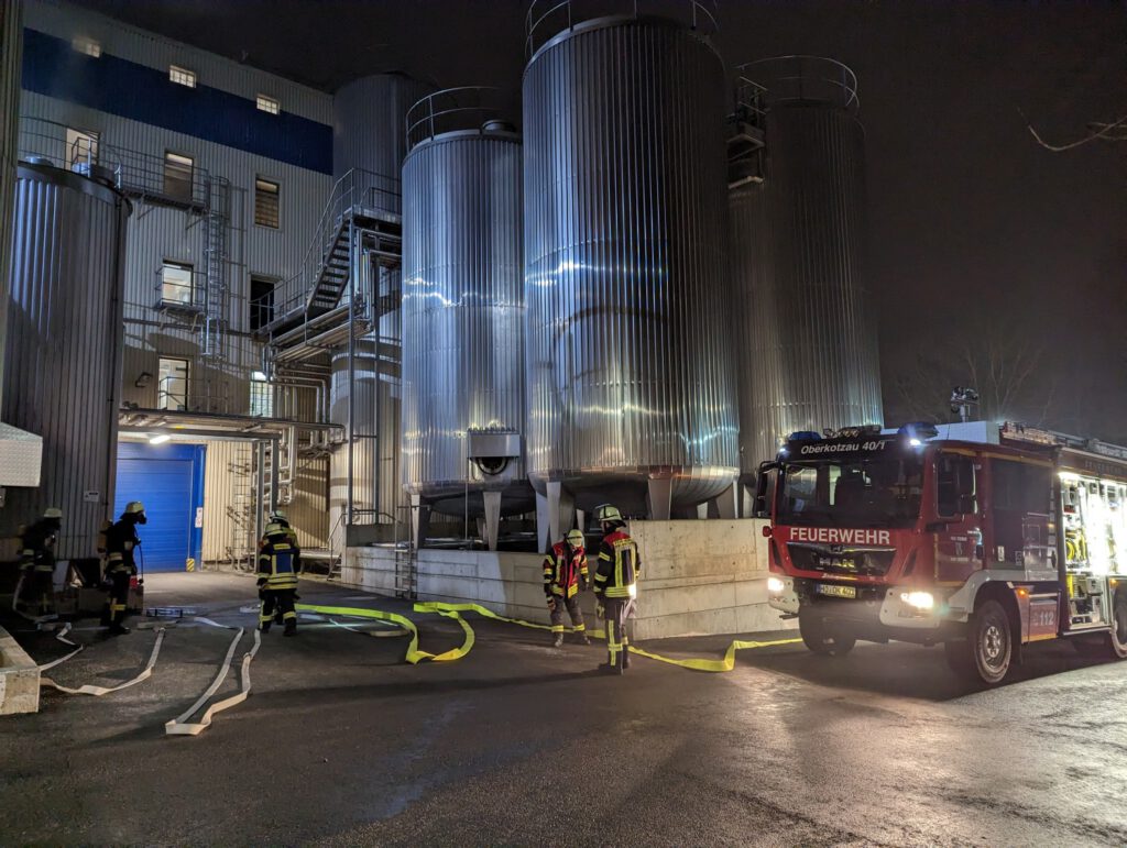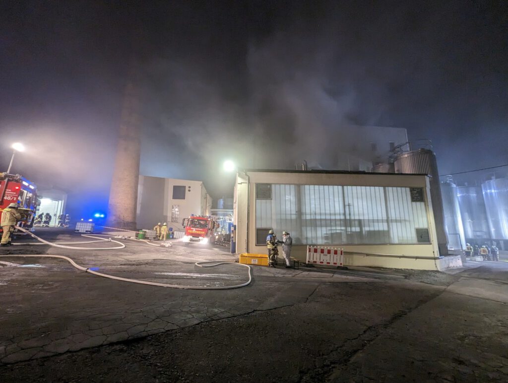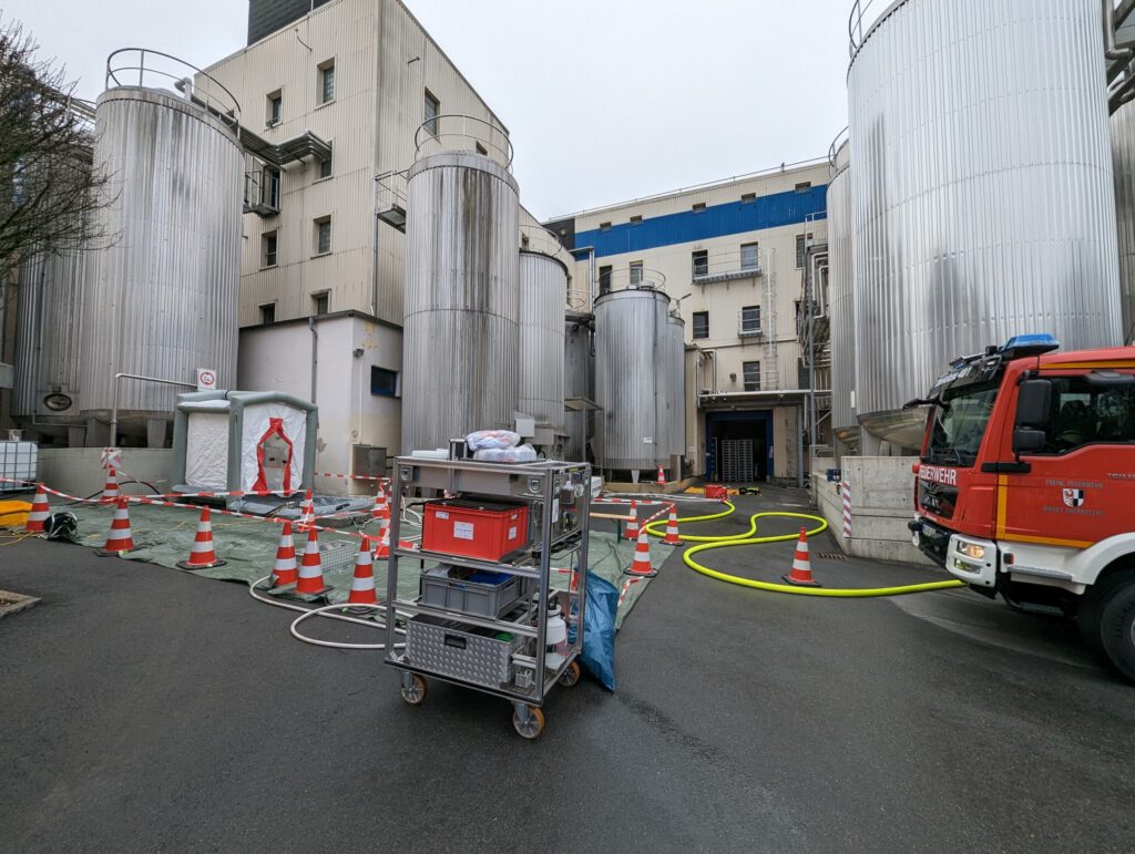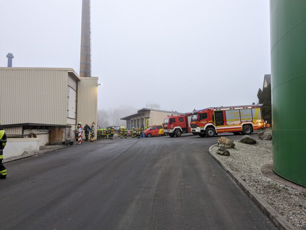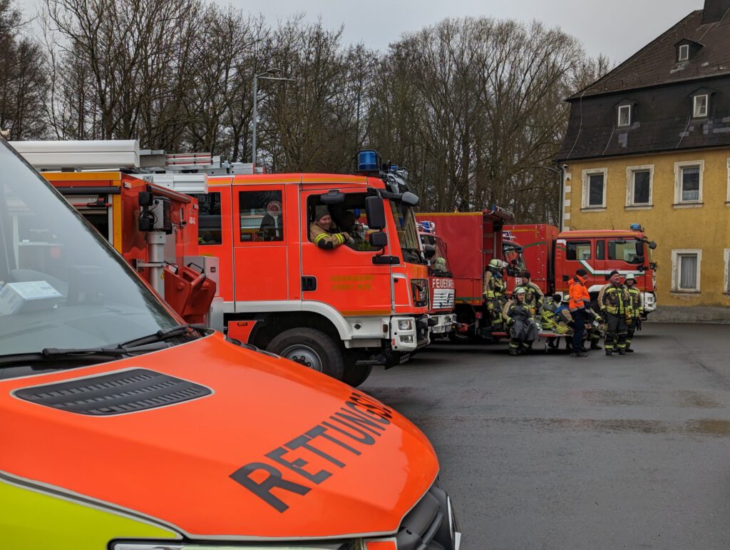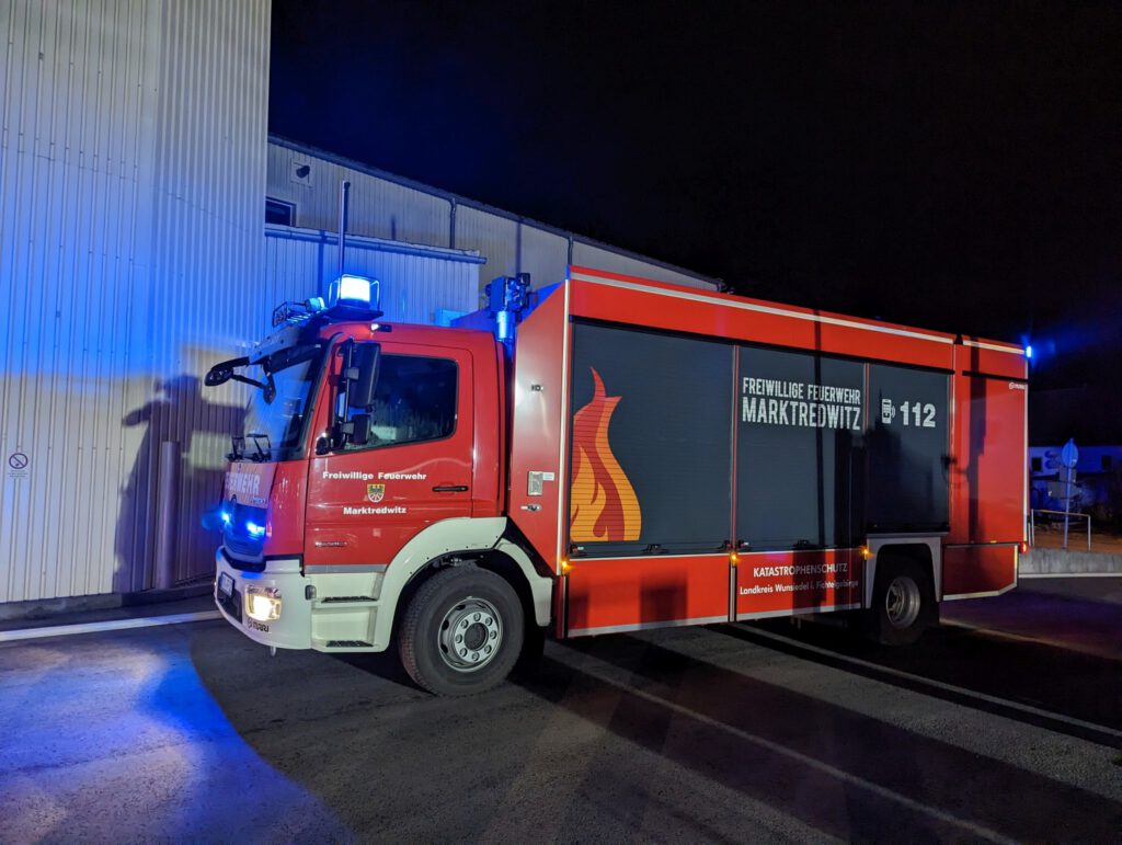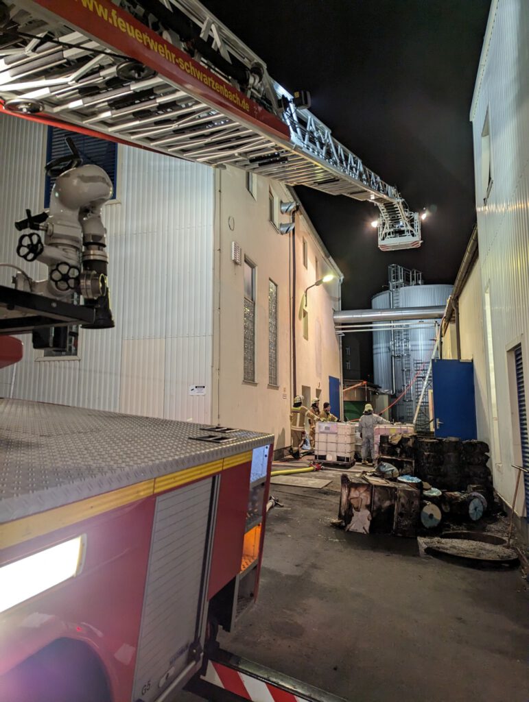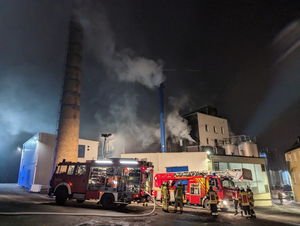 Die Feuerwehren wurden am 03.03.2023 um 04:18 Uhr wegen einer ausgelösten Brandmeldeanlage in einer Firma in Schwarzenbach an der Saale alarmiert. Beim Eintreffen teilten Mitarbeiter mit, es käme Rauch aus einem Kesselhaus. Ein Trupp ging unter Atemschutz zur Erkundung vor. Nachdem im Kesselhaus kein Brand festgestellt werden konnte, arbeitete man sich in die angrenzenden Räumen vor, wo schließlich eine brennende Maschine vorgefunden wurde. In dem Raum befanden sich außerdem mehrere 1000 Liter IBC-Behälter mit Gefahrenstoffen, von denen einer durch den Brand bereits stark beschädigt und ausgelaufen war.