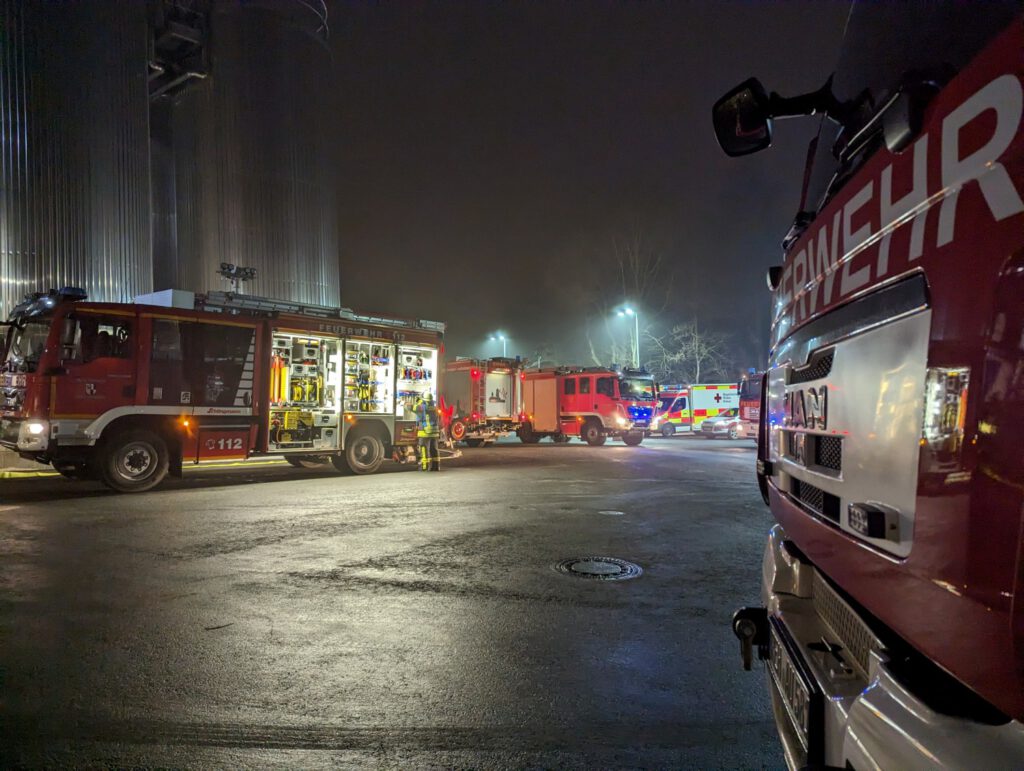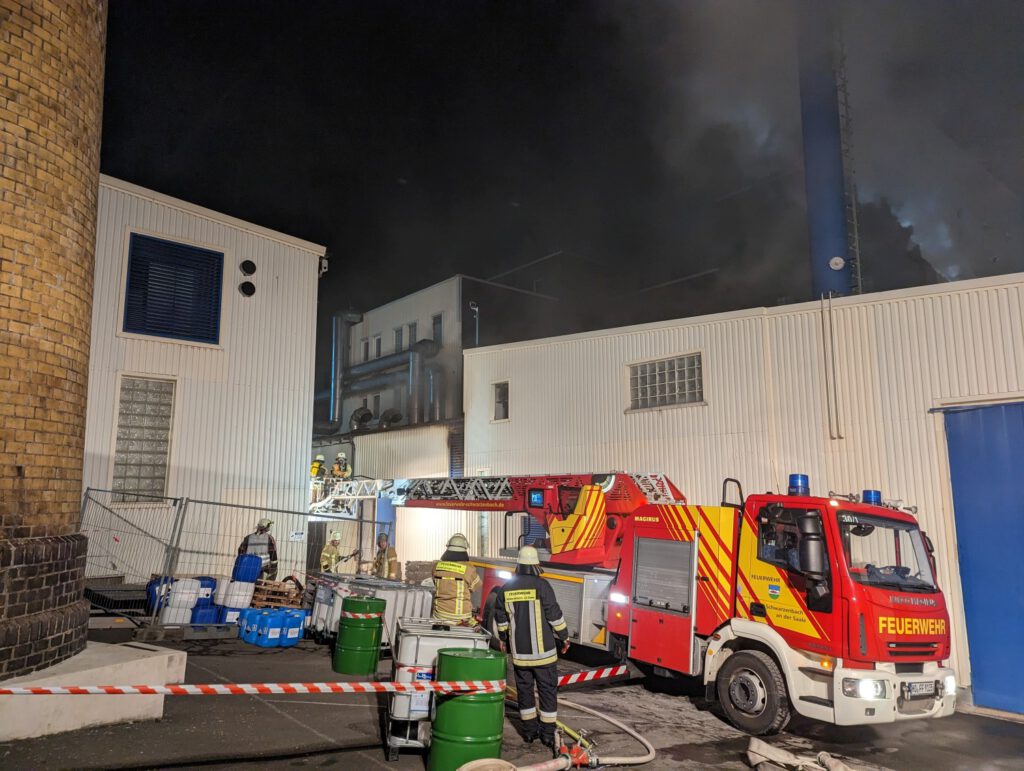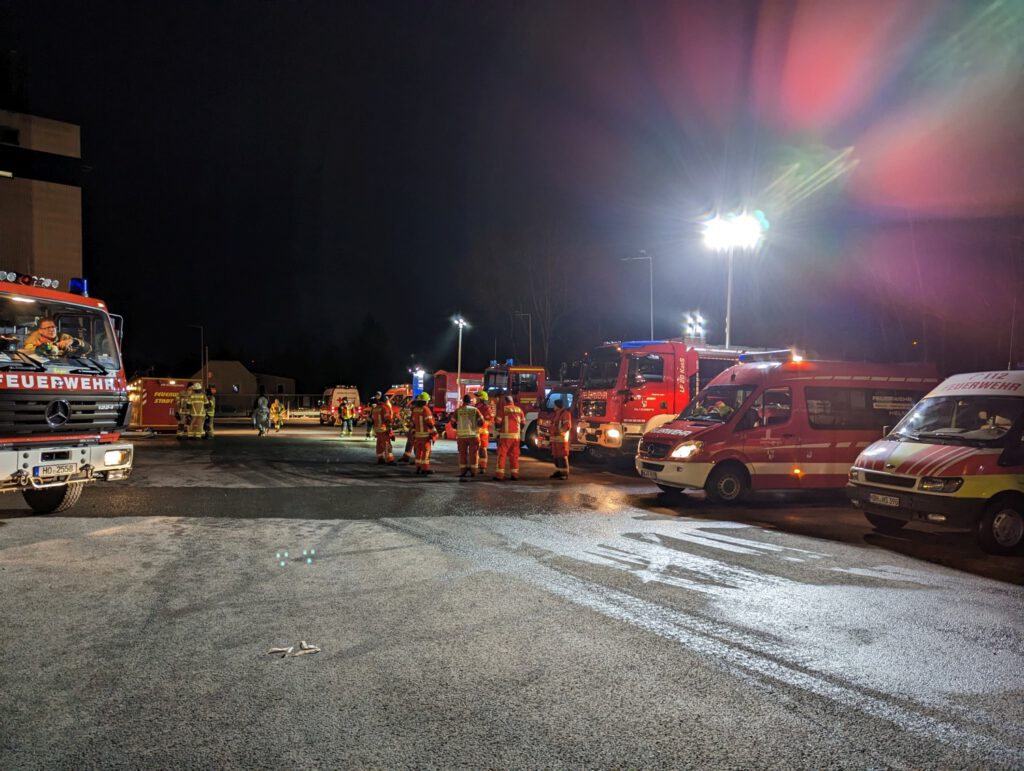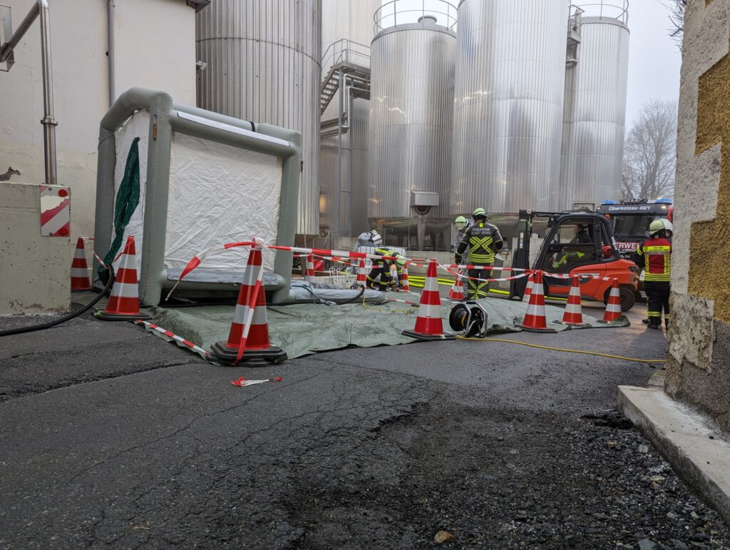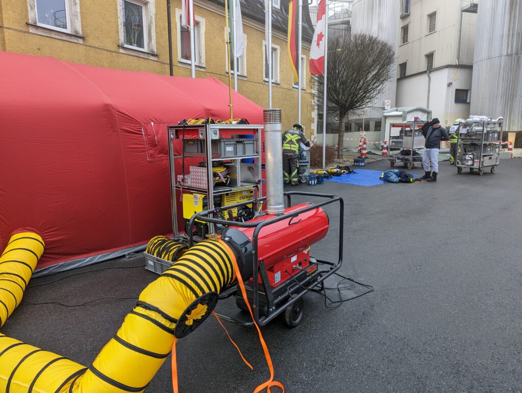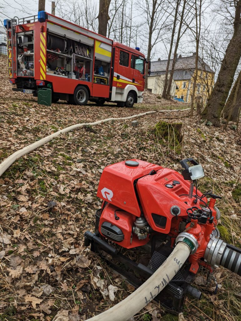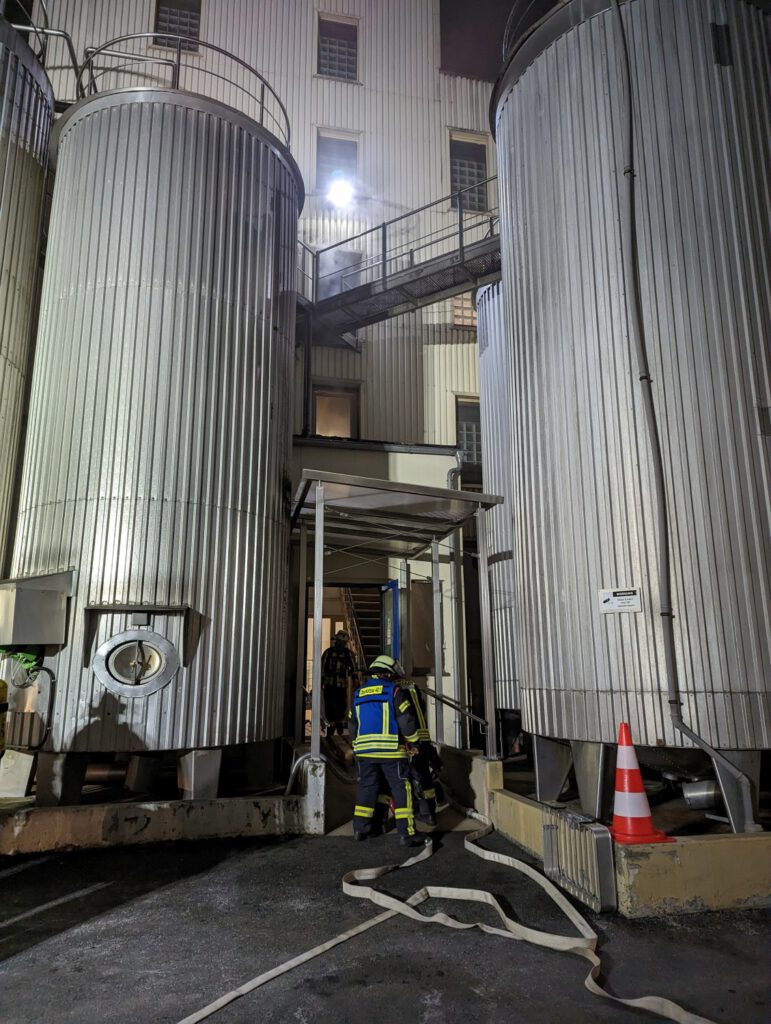 Die Feuerwehren wurden am 03.03.2023 um 04:18 Uhr wegen einer ausgelösten Brandmeldeanlage in einer Firma in Schwarzenbach an der Saale alarmiert. Beim Eintreffen teilten Mitarbeiter mit, es käme Rauch aus einem Kesselhaus. Ein Trupp ging unter Atemschutz zur Erkundung vor. Nachdem im Kesselhaus kein Brand festgestellt werden konnte, arbeitete man sich in die angrenzenden Räumen vor, wo schließlich eine brennende Maschine vorgefunden wurde. In dem Raum befanden sich außerdem mehrere 1000 Liter IBC-Behälter mit Gefahrenstoffen, von denen einer durch den Brand bereits stark beschädigt und ausgelaufen war.