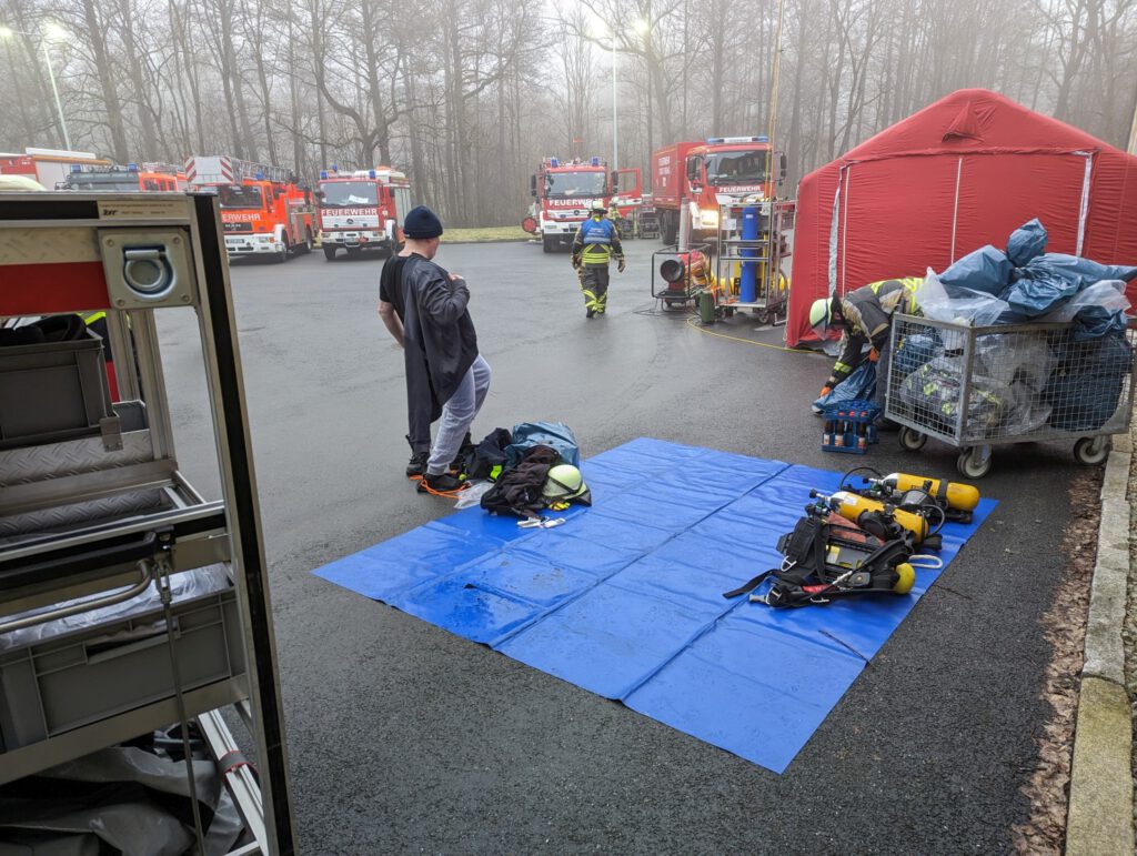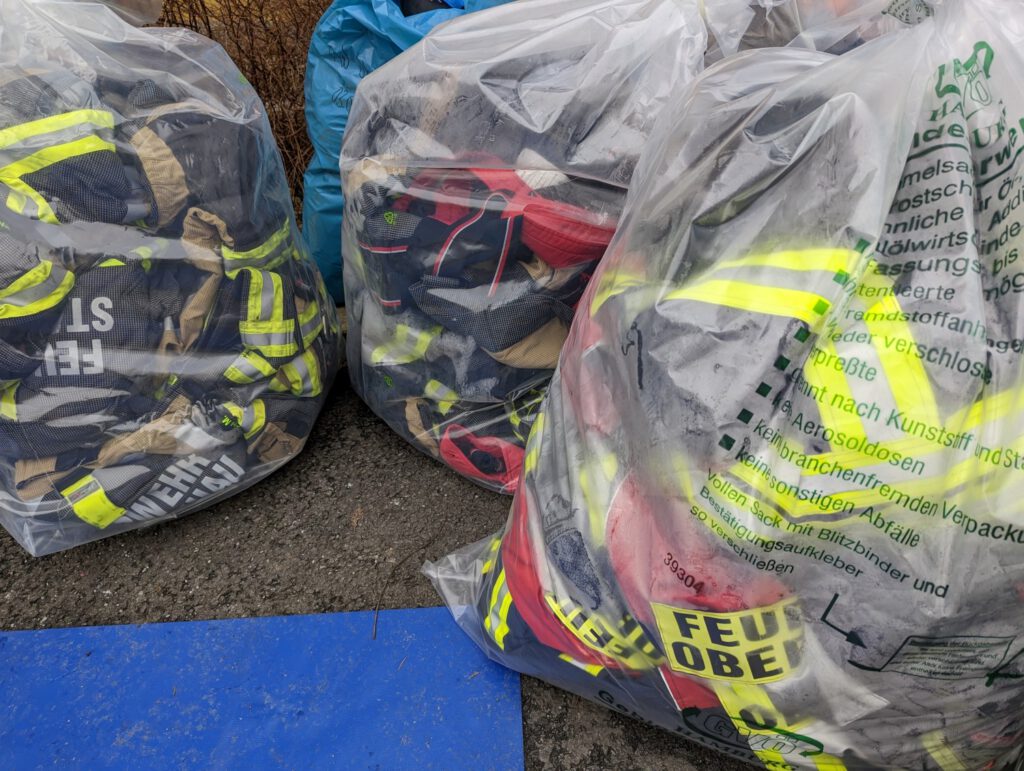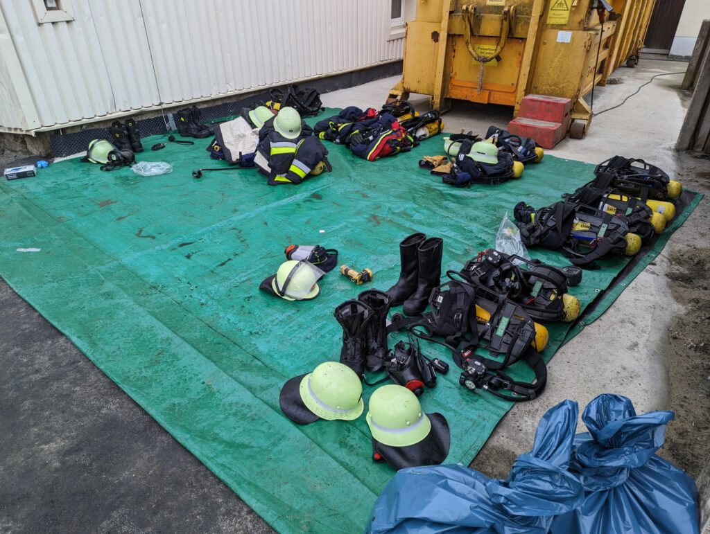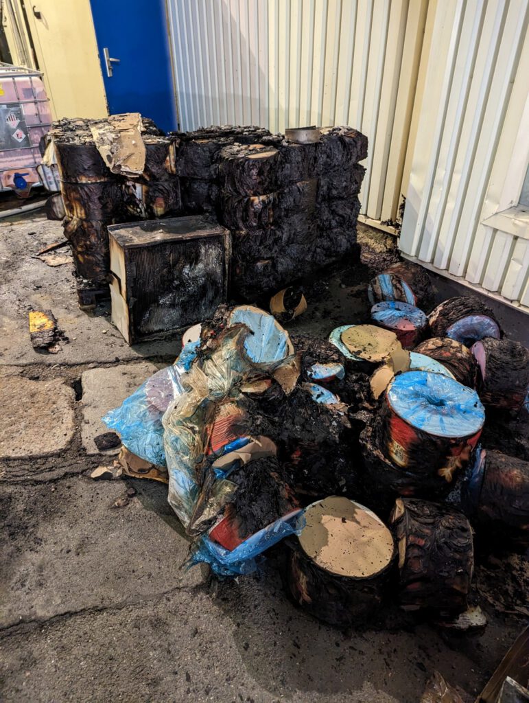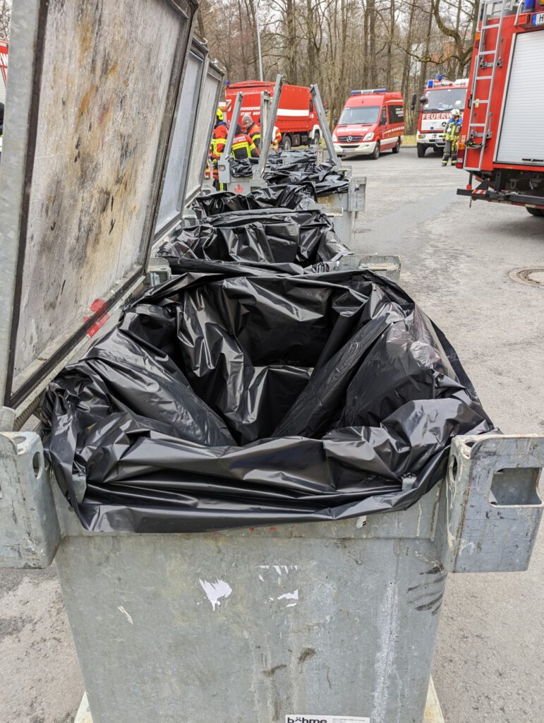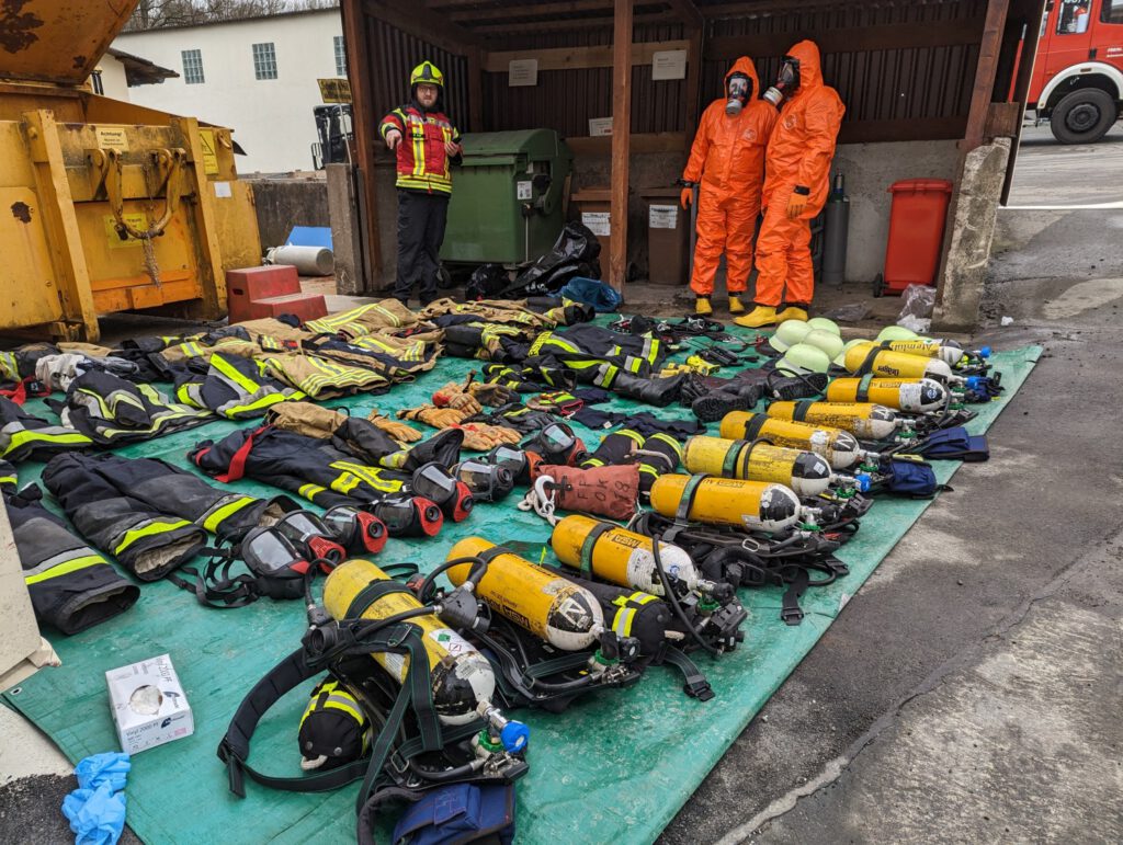 Nach Abschluß der Pumparbeiten war die Gefahr schließlich gebannt und es blieben noch Aufräumarbeiten. Der betroffene Bereich wurde mit Bindemittel abgestreut und mit der Wärmebildkamera nochmal auf Glutnester kontrolliert. Sämtliche Schutzkleidung und Ausrüstung, die mit einem der Stoffe in Kontakt gekommen sein könnten, müssen ausgemustert werden, darunter auch Pressluftatmer, Funkgeräte, Lampen und Helme. Von einer Entsorgungsfirma wurden dafür spezielle Metallcontainer zur Verfügung gestellt.