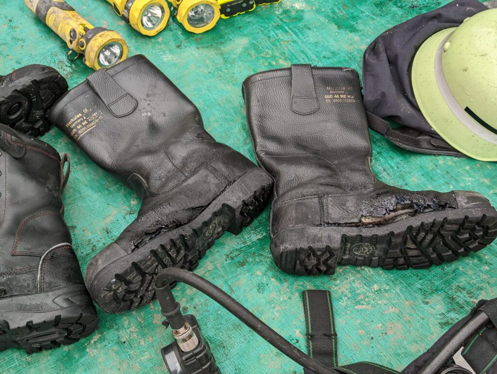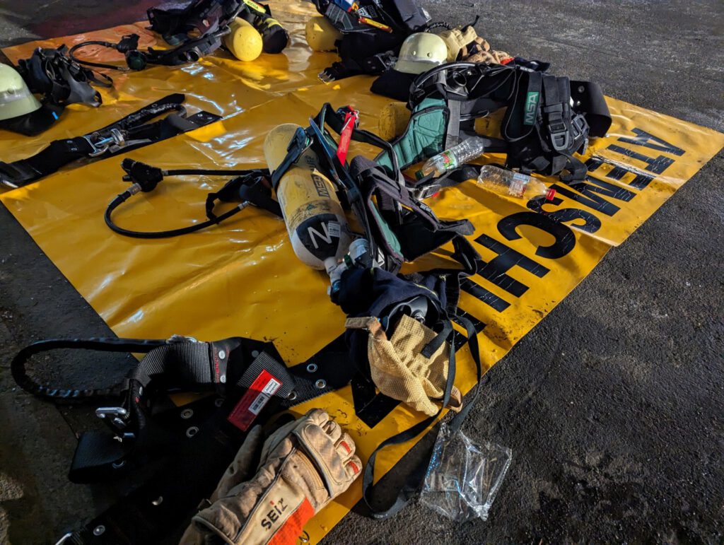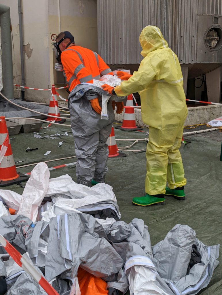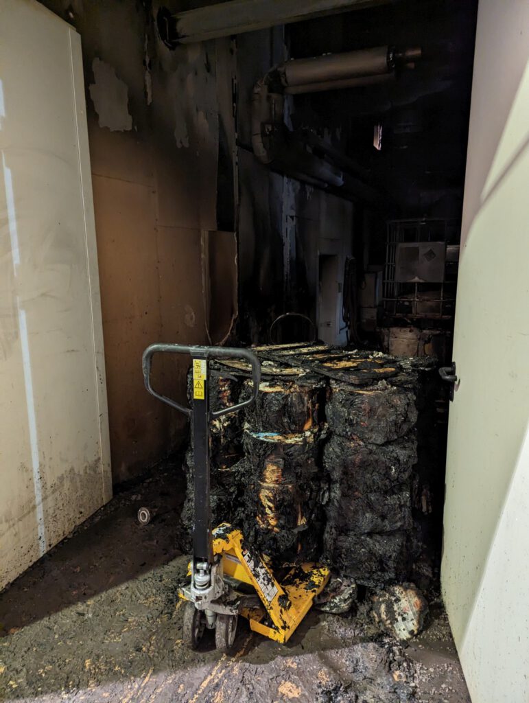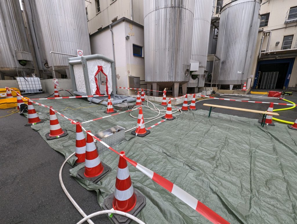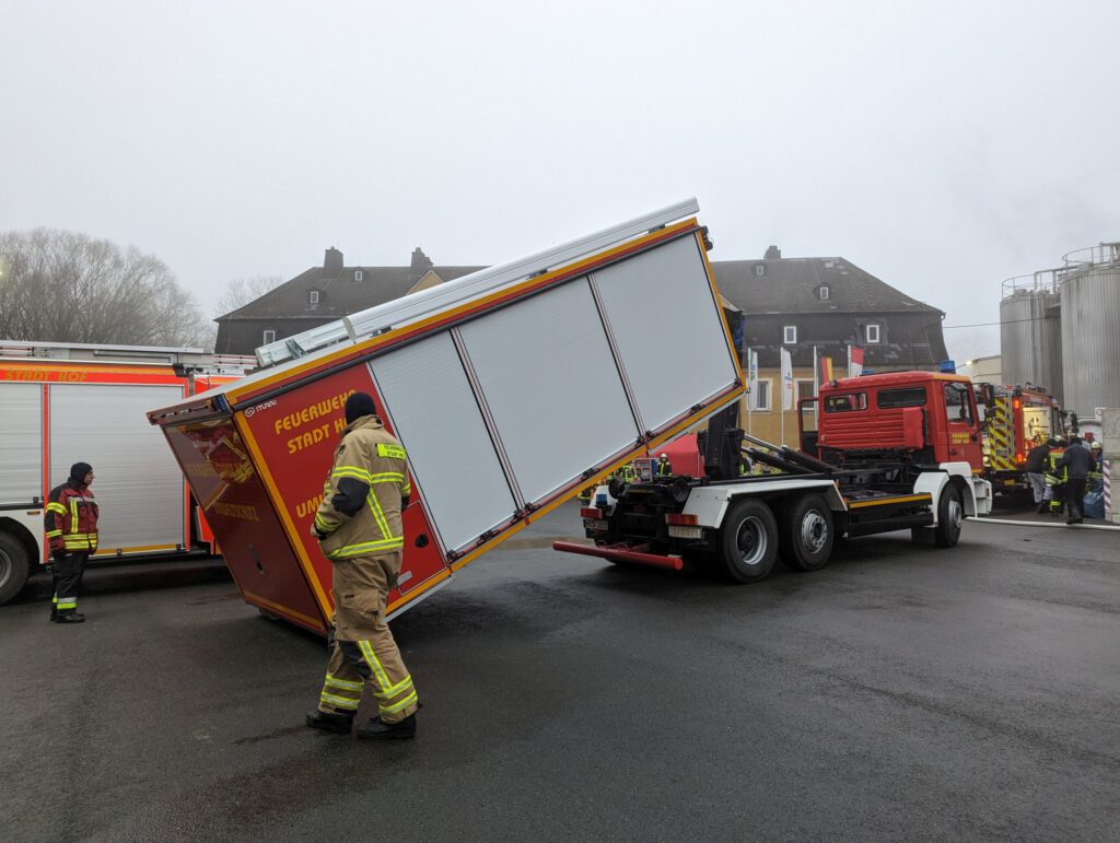 Nach Abschluß der Pumparbeiten war die Gefahr schließlich gebannt und es blieben noch Aufräumarbeiten. Der betroffene Bereich wurde mit Bindemittel abgestreut und mit der Wärmebildkamera nochmal auf Glutnester kontrolliert. Sämtliche Schutzkleidung und Ausrüstung, die mit einem der Stoffe in Kontakt gekommen sein könnten, müssen ausgemustert werden, darunter auch Pressluftatmer, Funkgeräte, Lampen und Helme. Von einer Entsorgungsfirma wurden dafür spezielle Metallcontainer zur Verfügung gestellt.