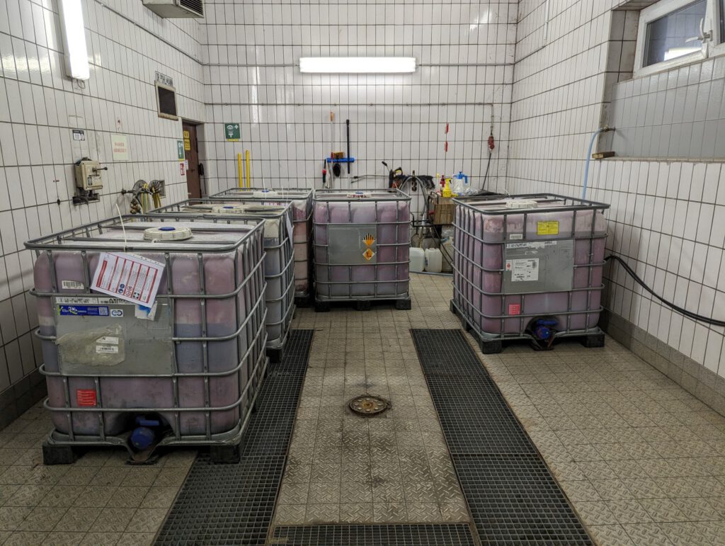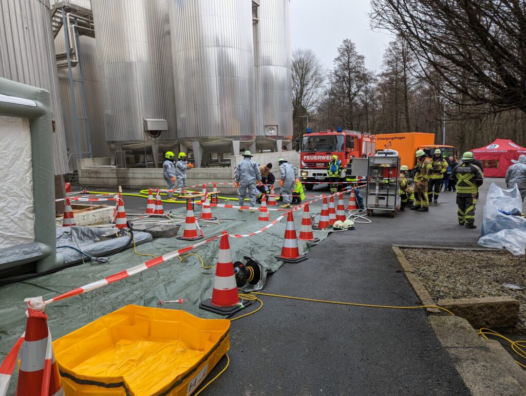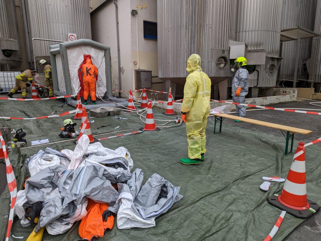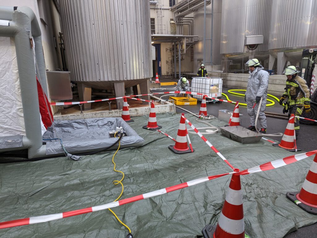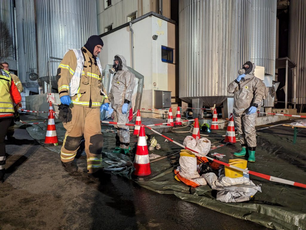 Nachdem das Feuer gelöscht war, konnte der Fokus auf die Gefahrstoffbehälter gelegt werden. Mehr als ein Dutzend der jeweils 1000 Liter fassenden IBC Container waren mit Hitze beaufschlagt und teilweise beschädigt worden. Mit Indikatorpapier wurde der pH-Wert der Flüssigkeiten gemessen, um zuordnen zu können, welcher Gefahrstoff sich in welchen Behältern befindet. Zur Beratung kam ein Chemiker der Sandler AG an die Einsatzstelle. Telefonisch stand man außerdem mit TUIS in Kontakt, die für Einsatzkräfte eine ständig besetzte Notfallhotline für Chemieunfälle unterhalten.