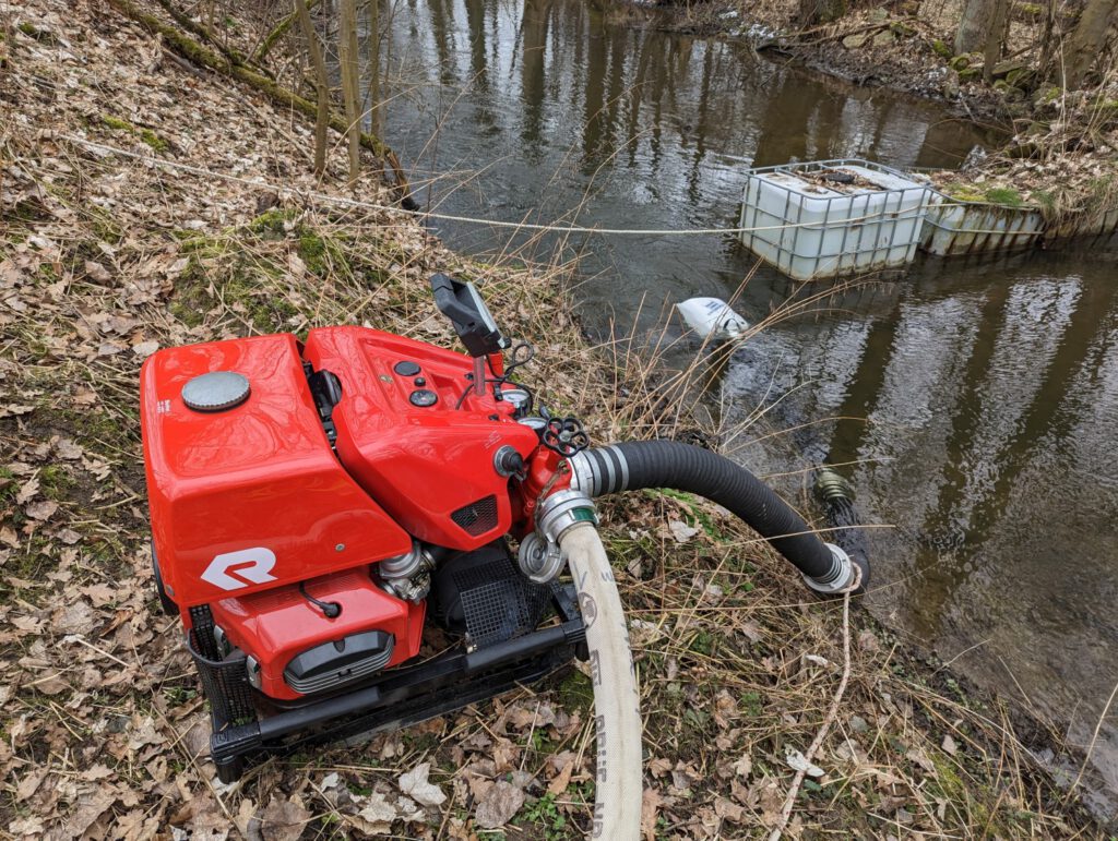 Nach Absprache entschied man sich dazu, die Stoffe mit einer Gefahrstoffpumpe in unbeschädigte Behälter umzupumpen. Aufgrund der Menge und Dickflüssigkeit einer der Stoffe zog sich der Vorgang über mehrere Stunden hinweg. Beim Wechsel auf den jeweils nächsten Stoff mussten die Pumpe und Schläuche mit ausreichend Wasser gespült werden, um eine Vermischung der Stoffe zu verhindern. Während der Arbeiten fiel nach einer Weile die Gefahrstoffpumpe mit technischem Defekt aus und es musste der Gerätewagen Gefahrgut der Feuerwehr Marktredwitz mit einem Ersatzgerät angefordert werden.