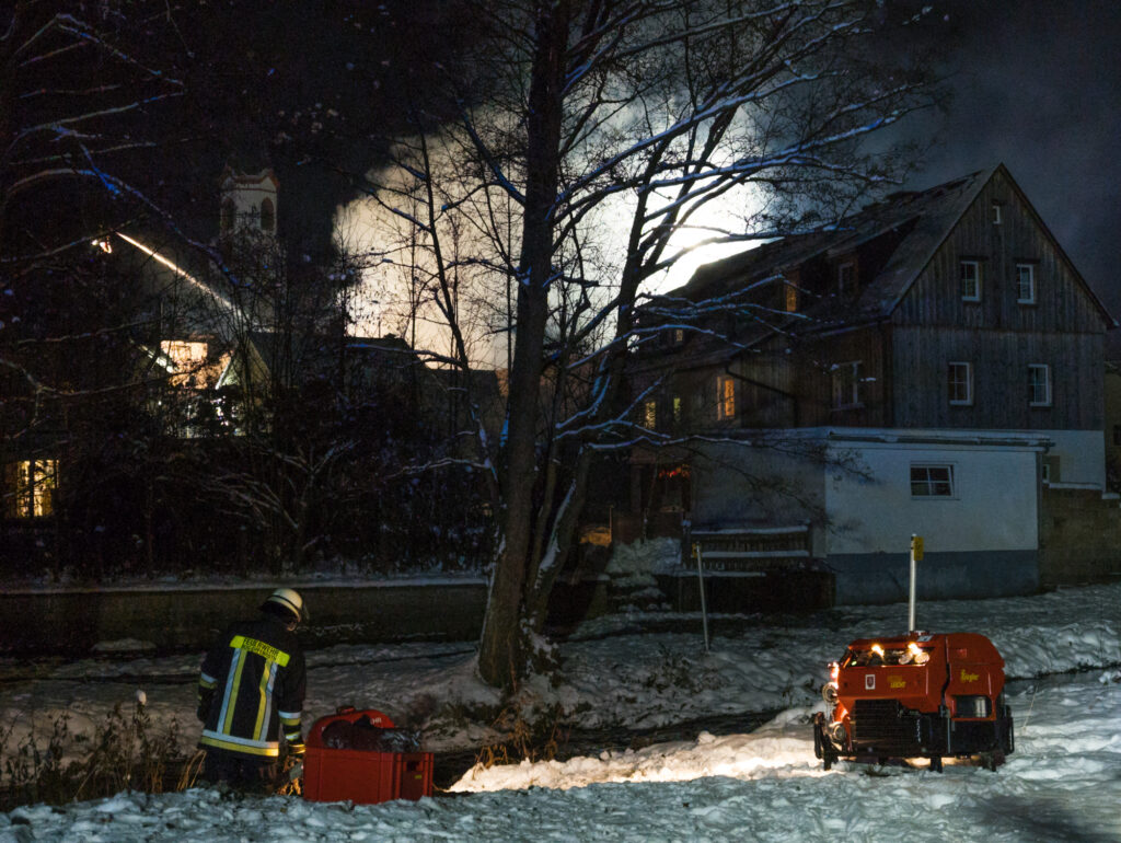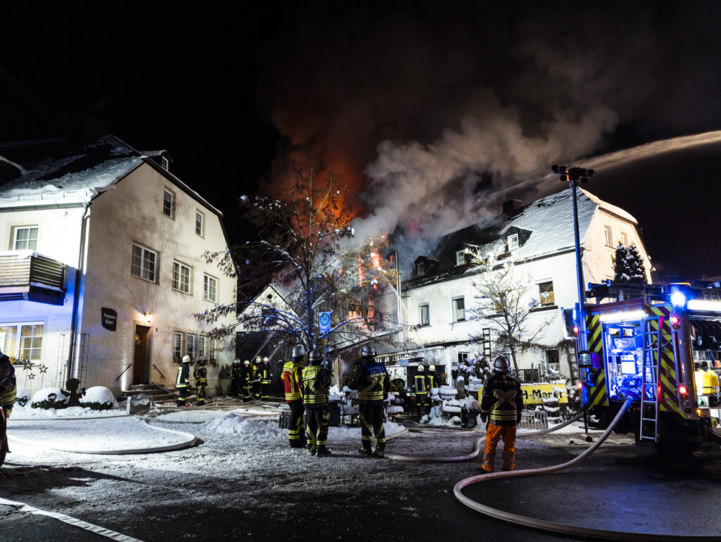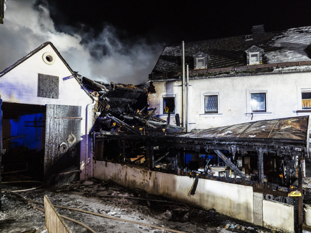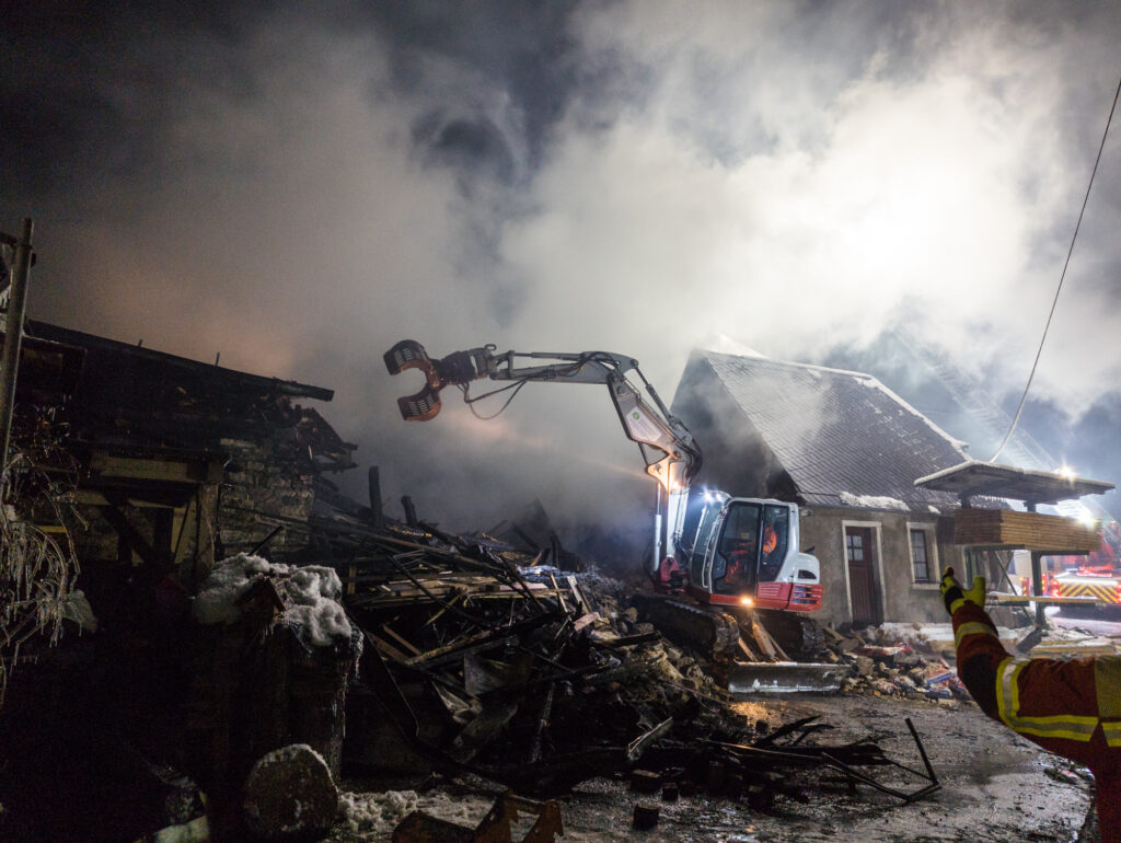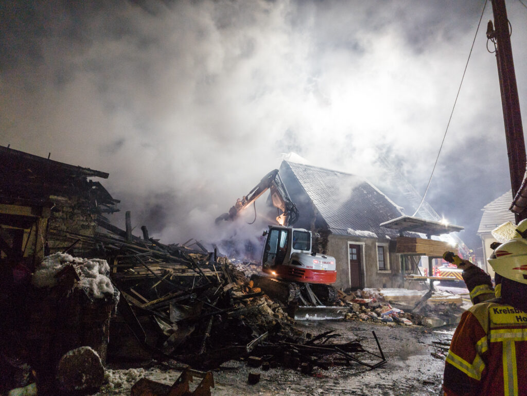 Erst der Einsatz eines Baggers sorgte für die Wende. Mit diesem konnten das Dach und Obergeschoß eingerissen werden und somit der Brandherd für einen Löschangriff freigelegt werden.