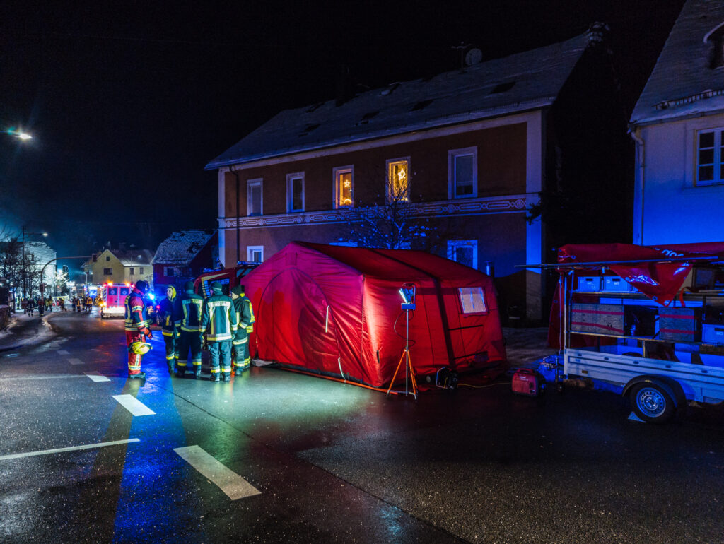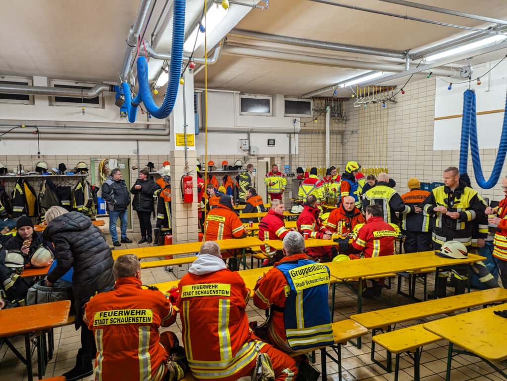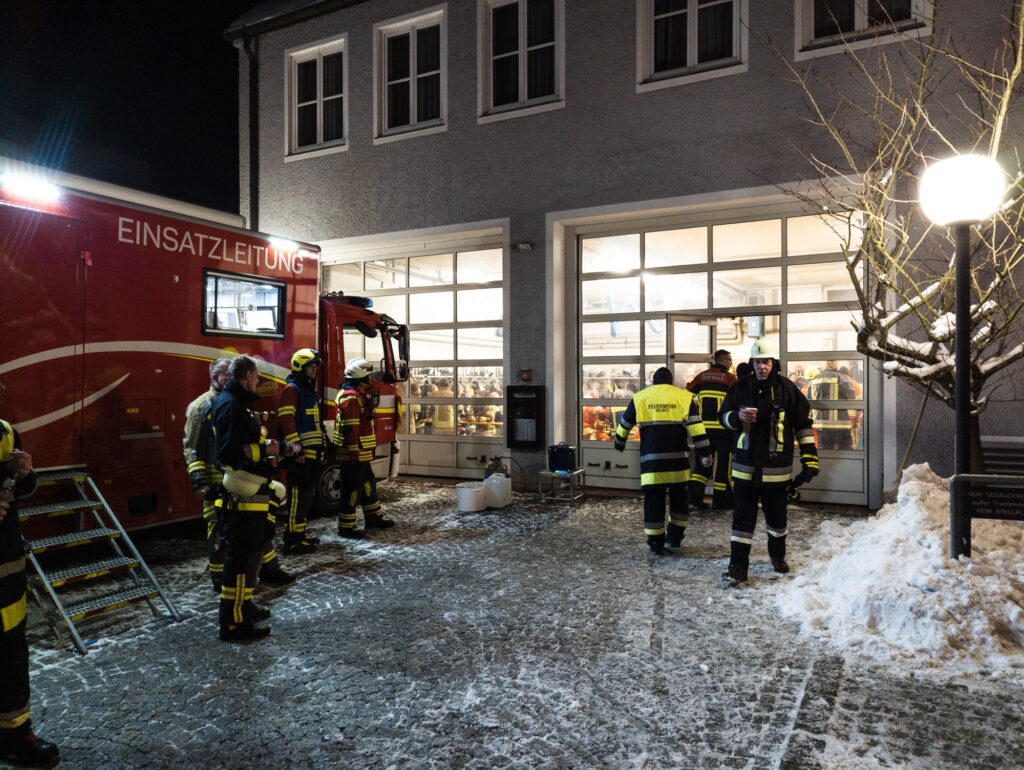 Vor dem Gerätehaus der Feuerwehr Weissdorf wurde die Einsatzleitung eingerichtet. In der Fahrzeughalle wurden Bierzeltgarnituren aufgebaut, damit sich hier Einsatzkräfte aufwärmen und etwas ausruhen konnten. Im Laufe der Nacht wurde hier auch eine Verpflegungsstelle eingerichtet, die vom THW mit kalten und warmen Getränken und dem RKT mit warmen Würstchen versorgt wurde.