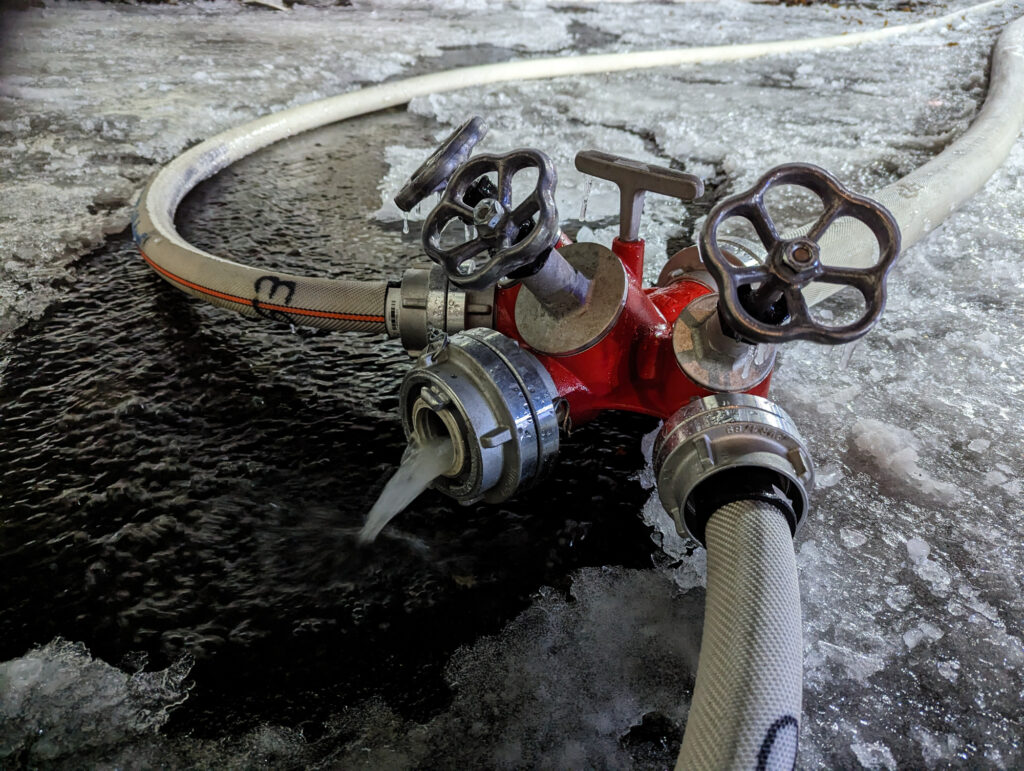 Aufgrund der Minusgrade musste immer etwas Wasser laufen gelassen werden, damit die Pumpen, Schläuche und Armaturen nicht einfrieren. Mit Streusalz wurde verhindert, dass sich alles in eine glatte Eisbahn verwandelt.