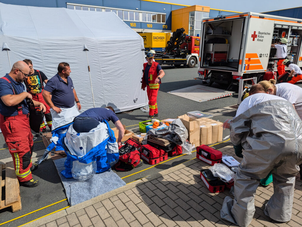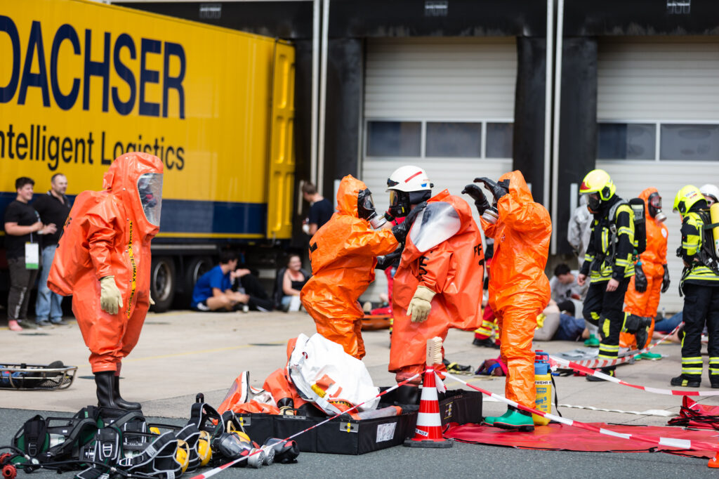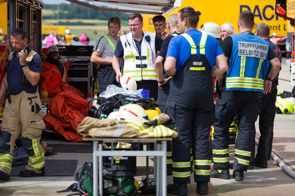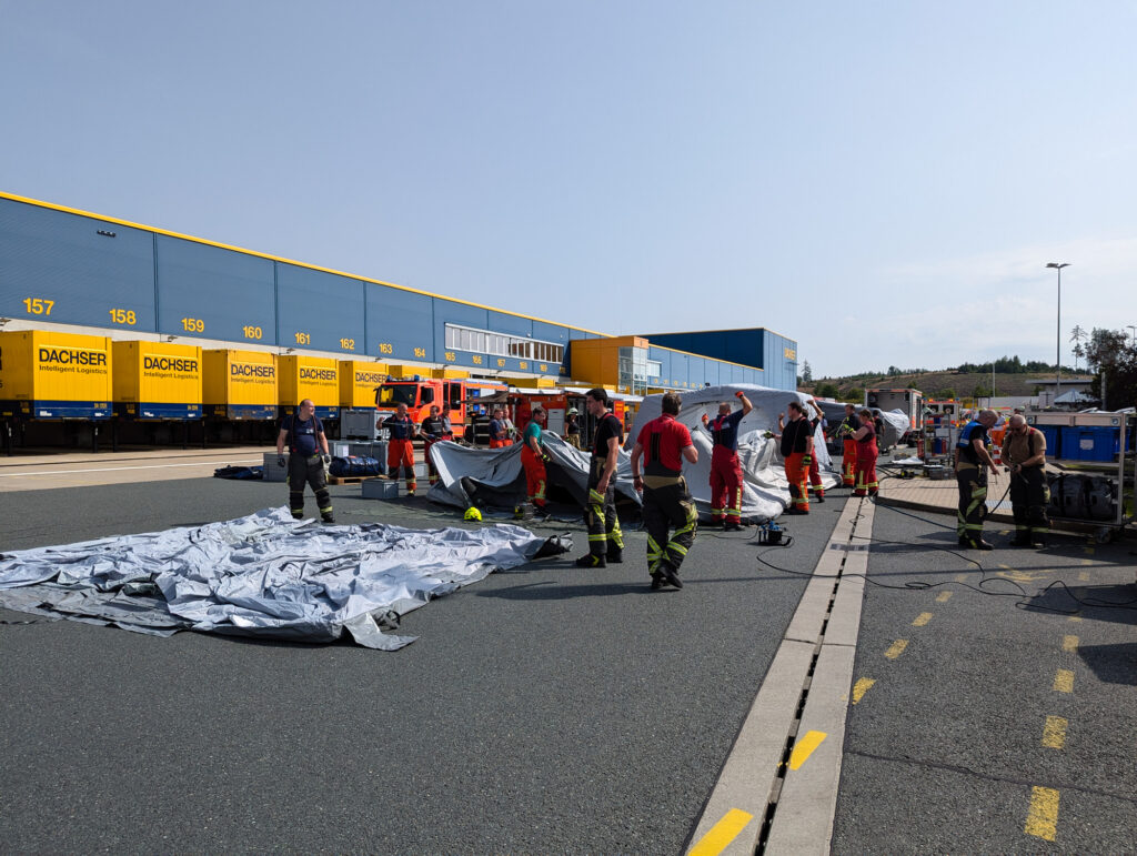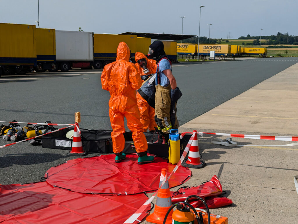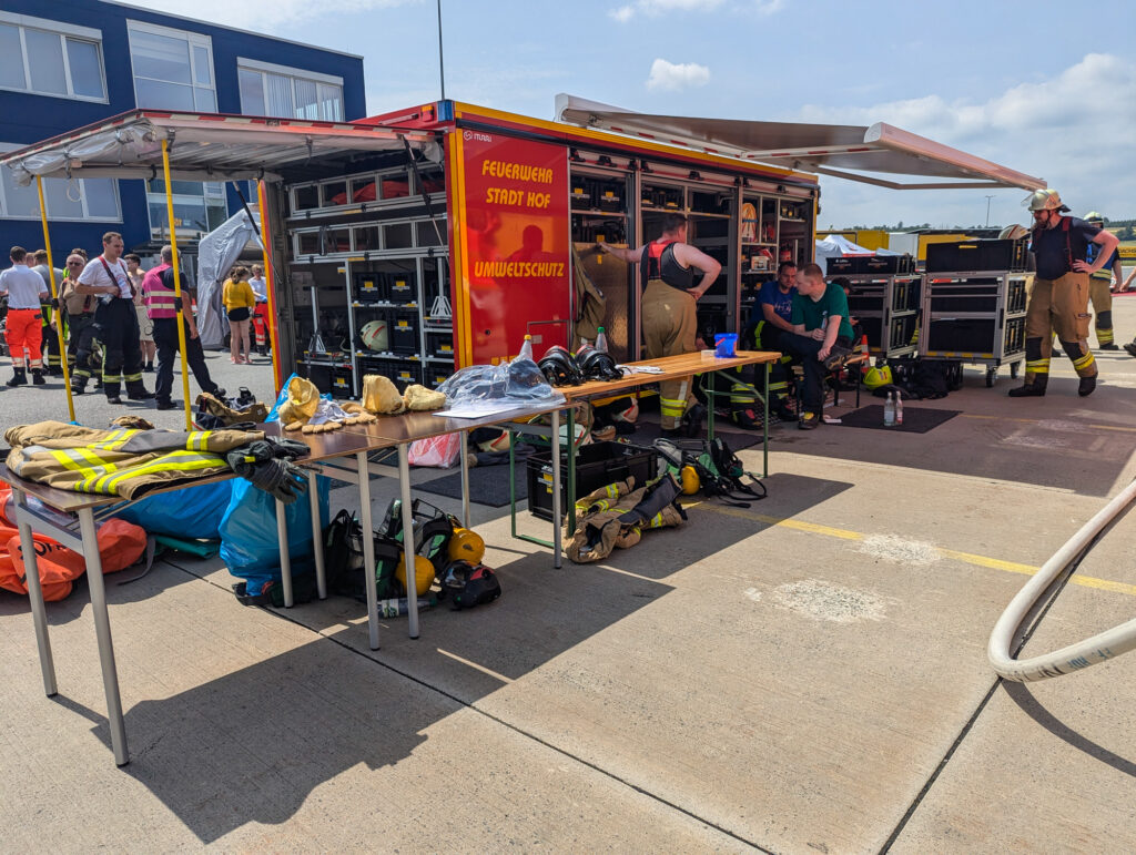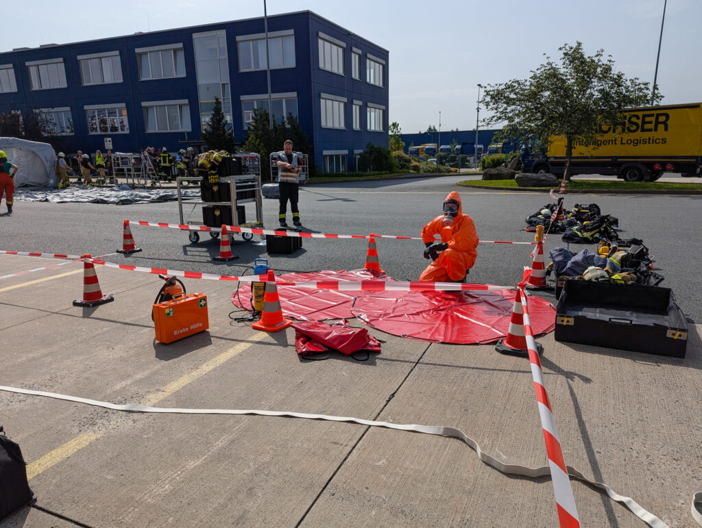 Am 29.06. fand auf dem Gelände der Firma Dachser in Hof eine groß angelegte Einsatzübung statt. Das angenommene Szenario: In einer Halle kam es zu einer Verpuffung eines Gefahrenstoffes. Dabei wurden mehrere Personen verletzt, weitere werden noch vermisst. Verschiedene Gefahrenstoffe sind ausgetreten.