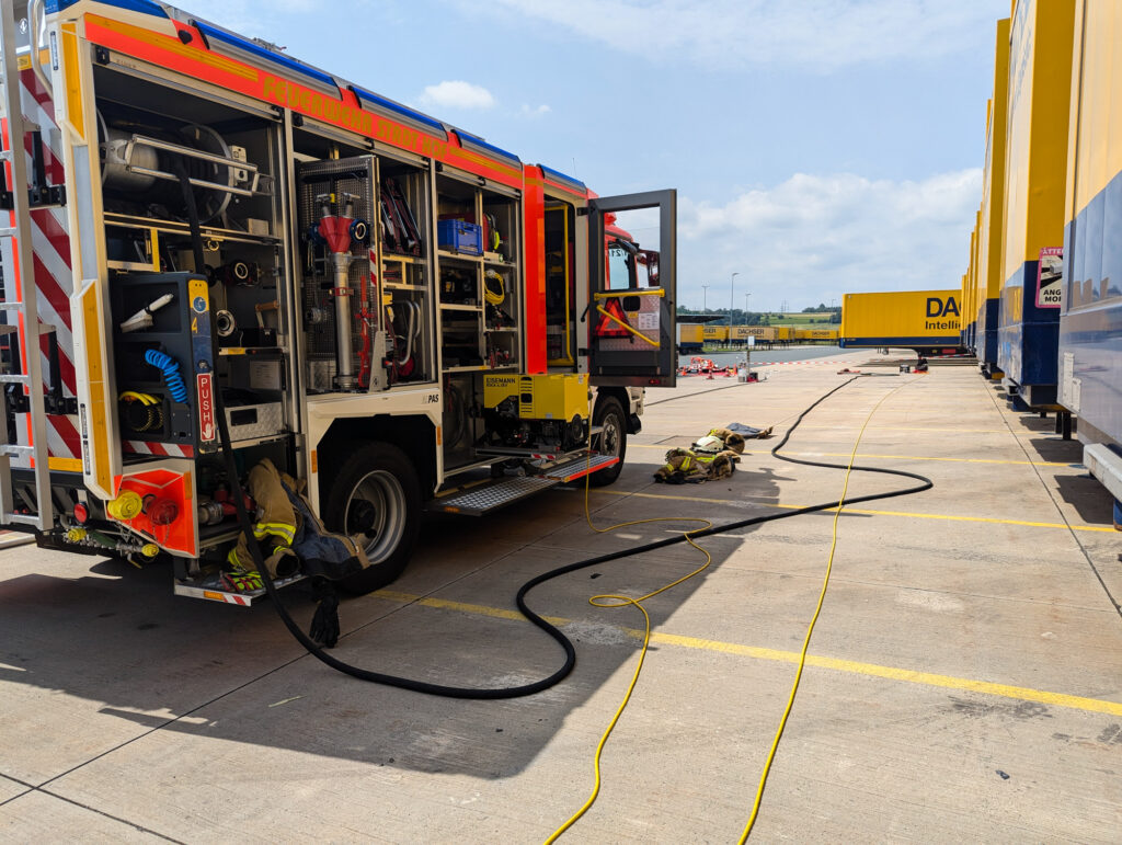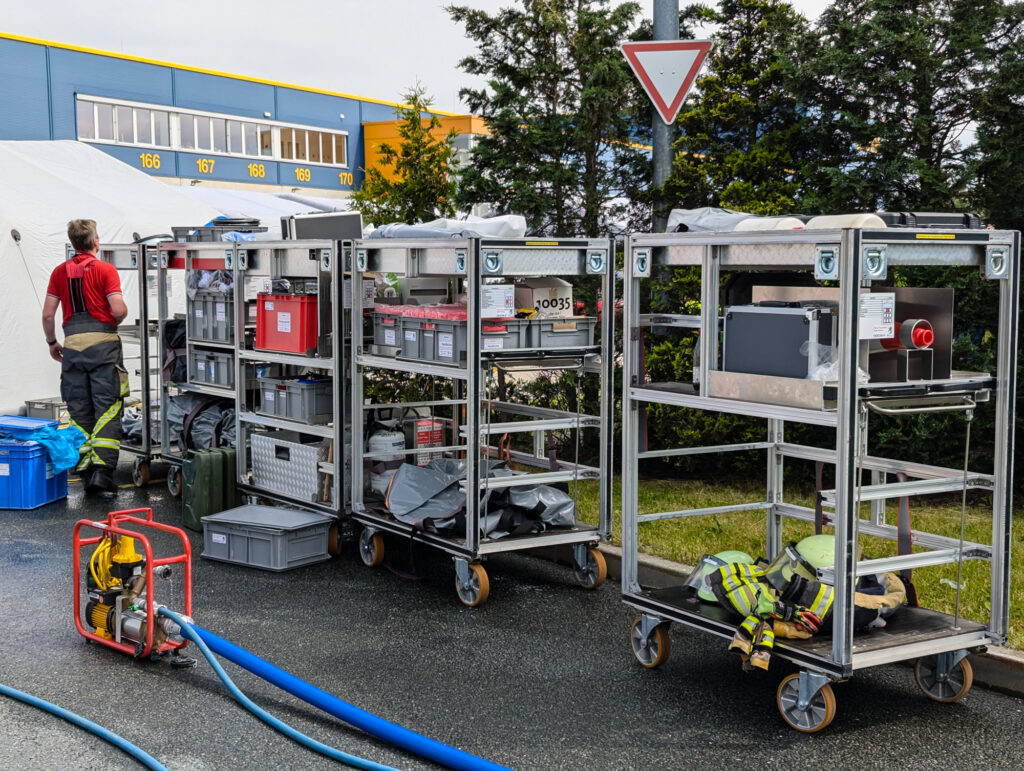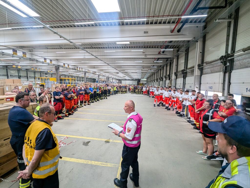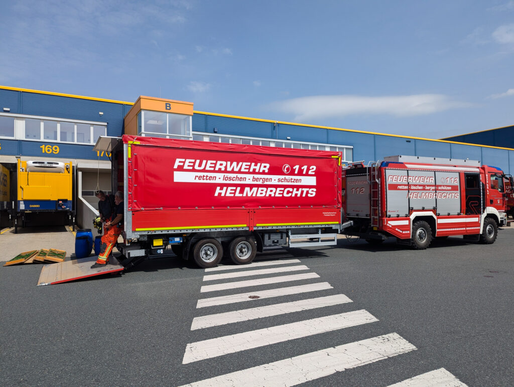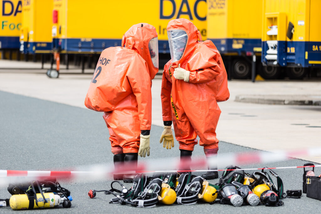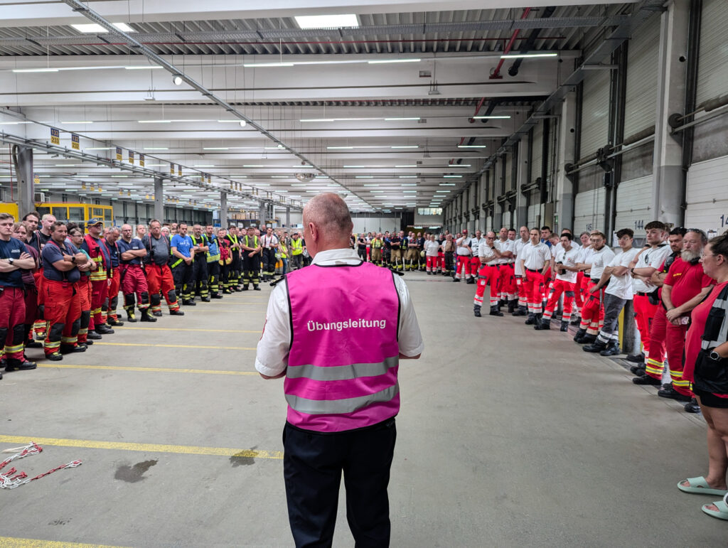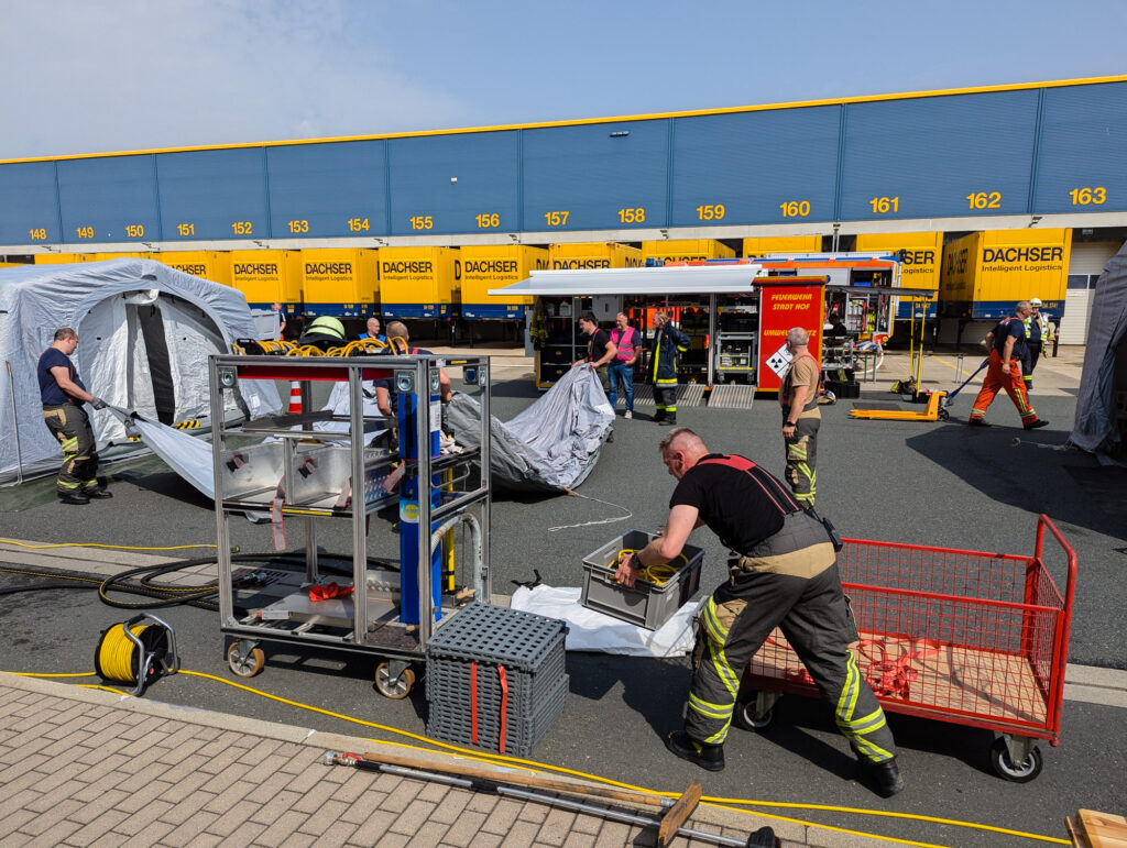 Am 29.06. fand auf dem Gelände der Firma Dachser in Hof eine groß angelegte Einsatzübung statt. Das angenommene Szenario: In einer Halle kam es zu einer Verpuffung eines Gefahrenstoffes. Dabei wurden mehrere Personen verletzt, weitere werden noch vermisst. Verschiedene Gefahrenstoffe sind ausgetreten.