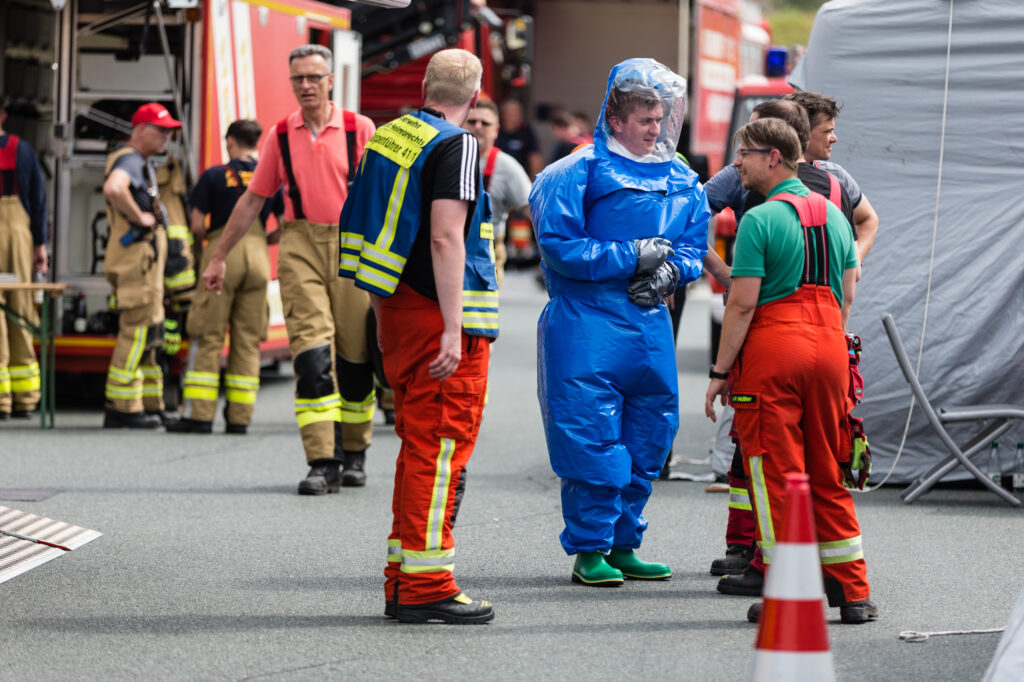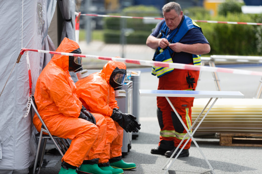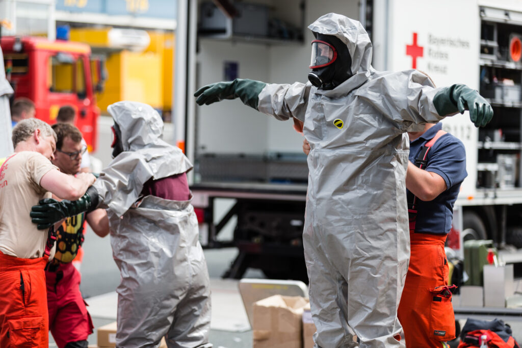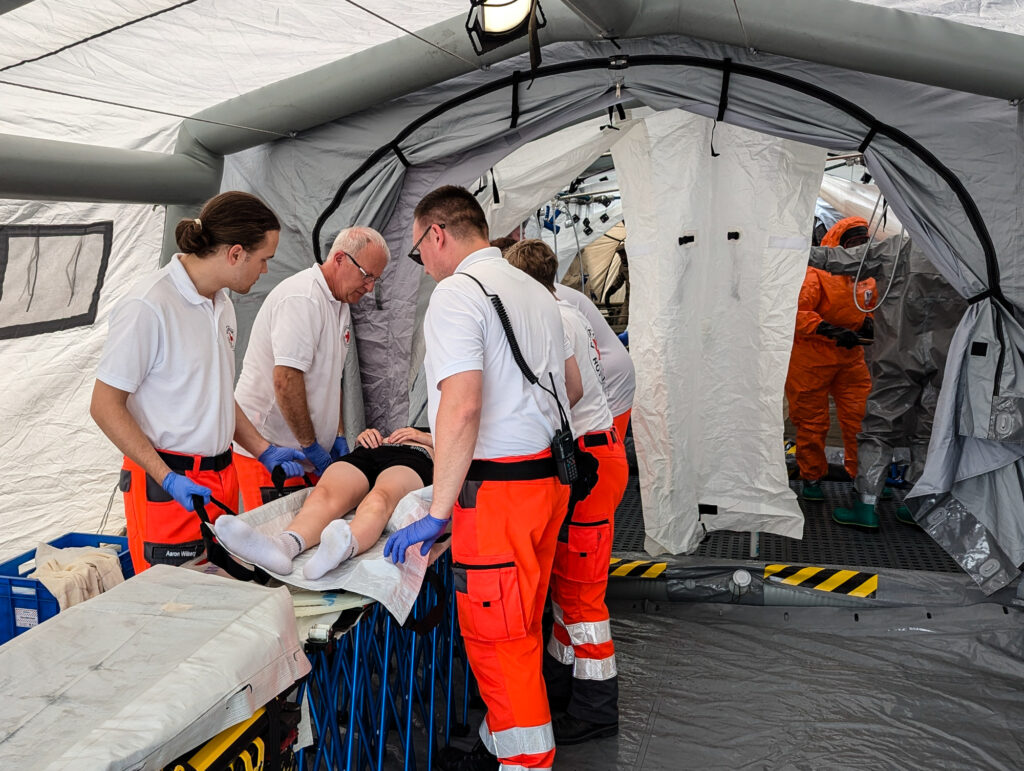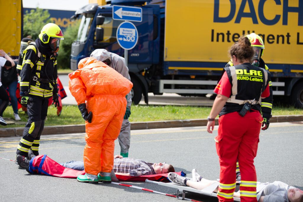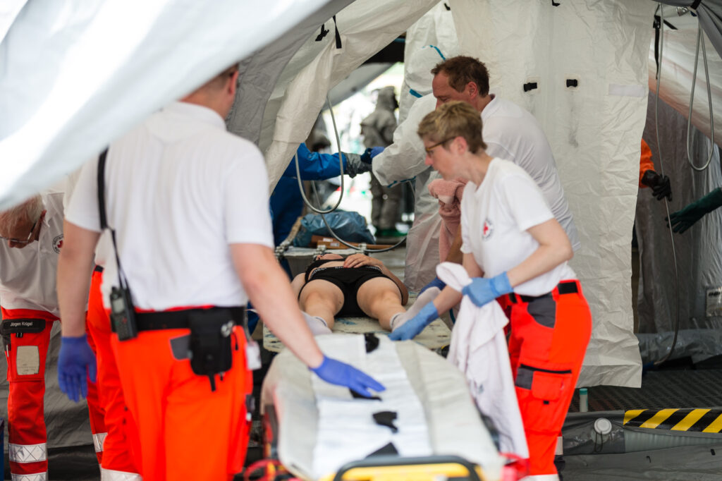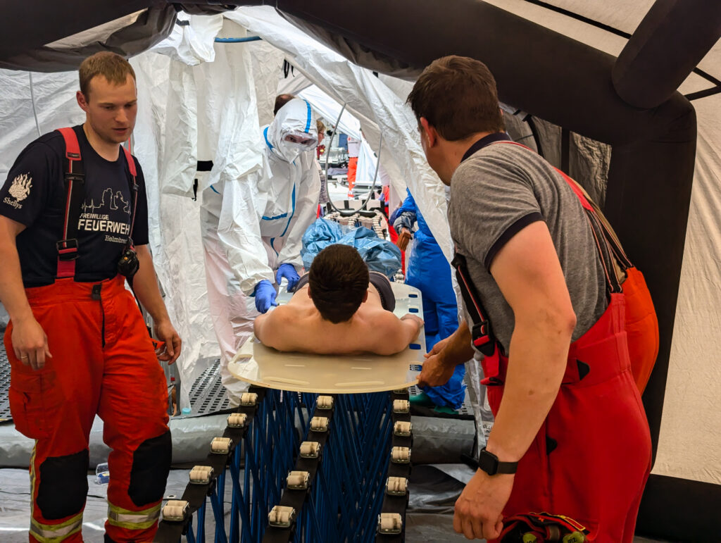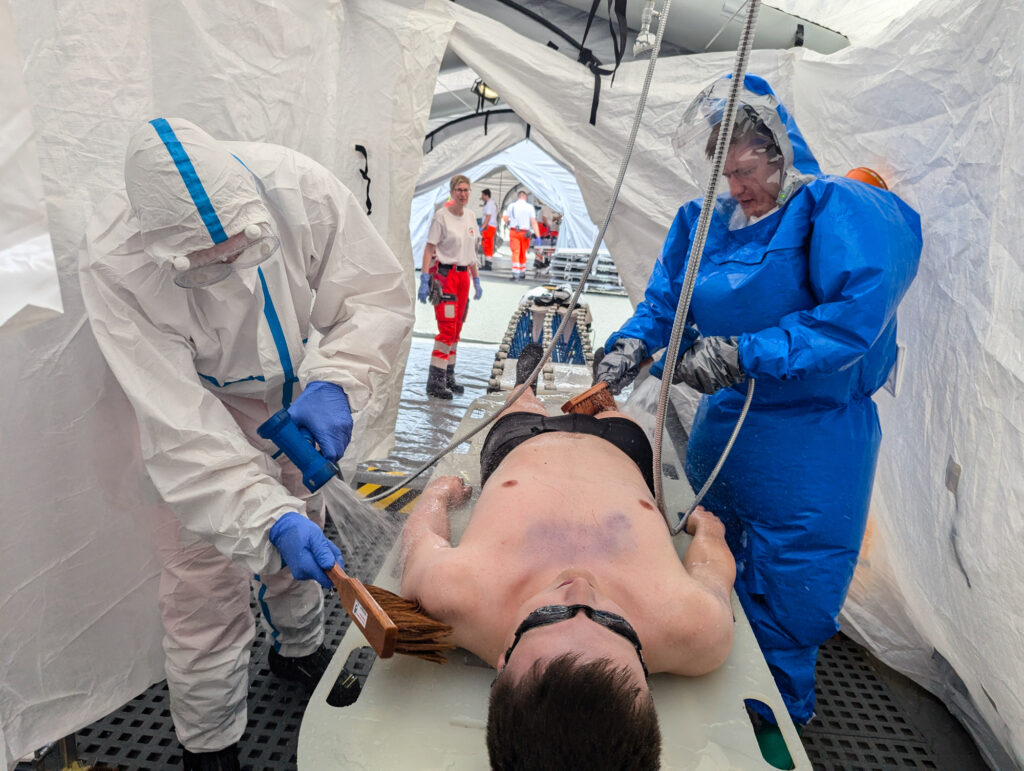 Da die Personen, so die Übungsannahme, mit Gefahrstoffen in Kontakt gekommen sein könnten, war eine direkte Übergabe an den Rettungsdienst zur weiteren Behandlung ausgeschlossen. Die Verletzten mussten vorher dekontaminiert werden, um eine Verschleppung der gefährlichen Stoffe zu verhindern und die Sicherheit des medizinischen Personals zu gewährleisten.