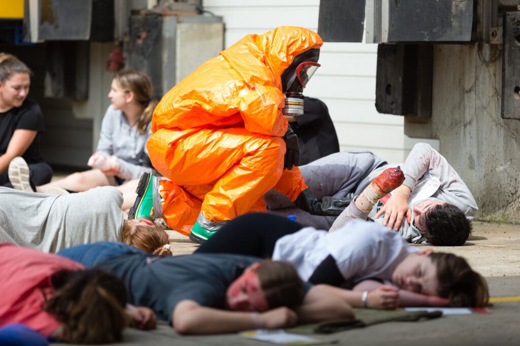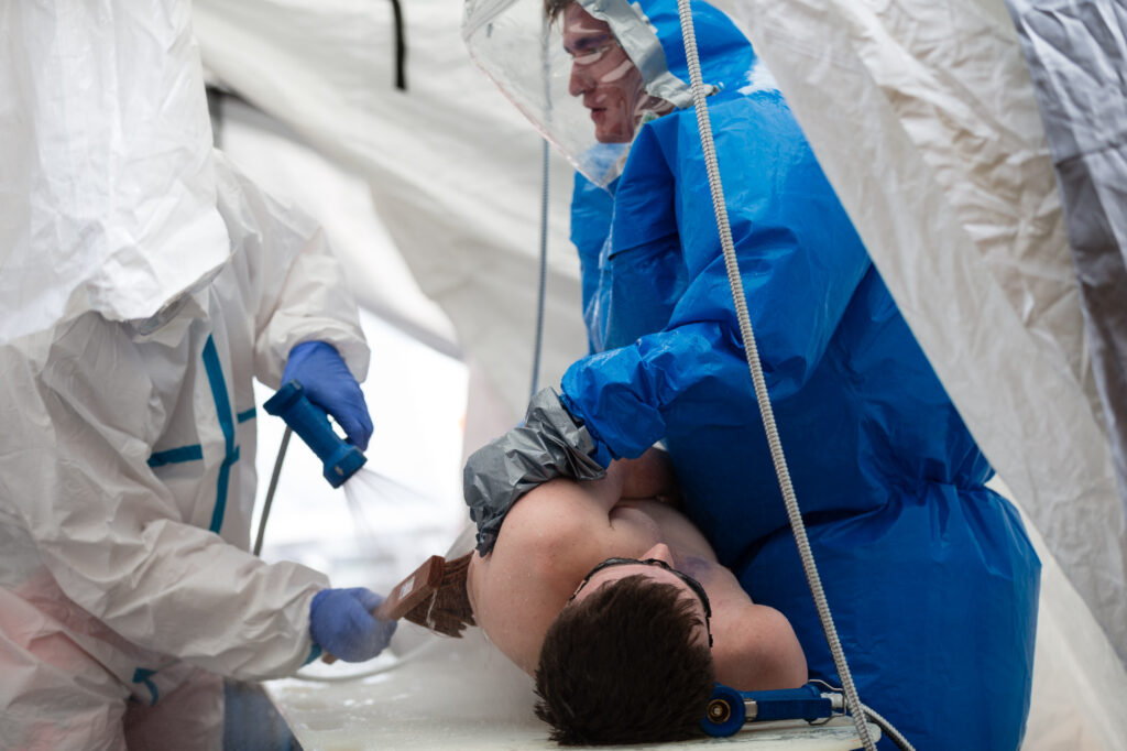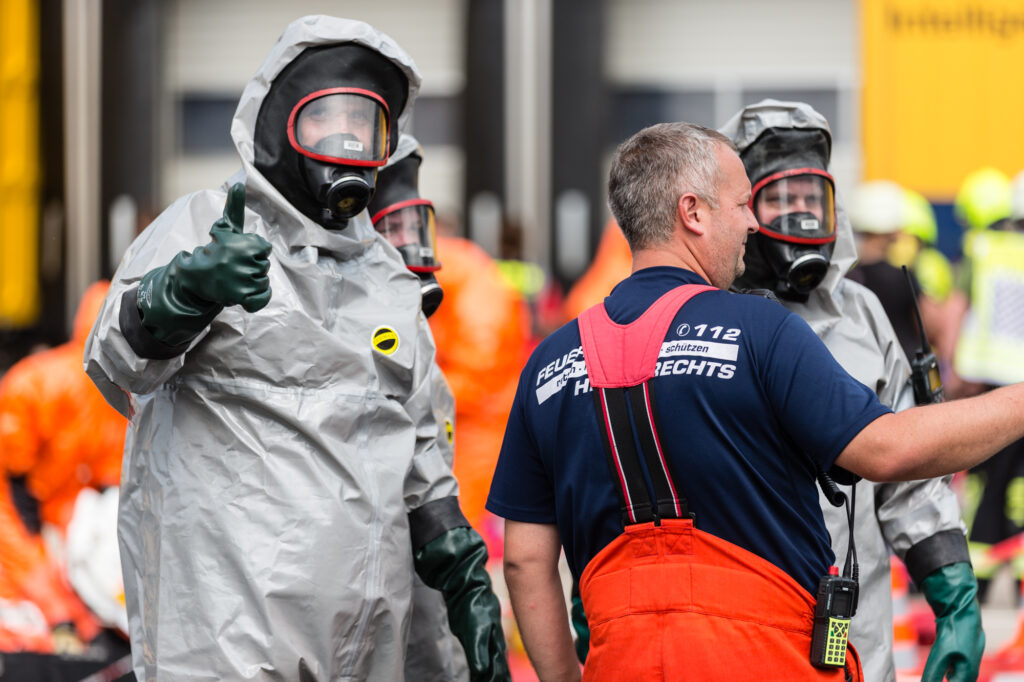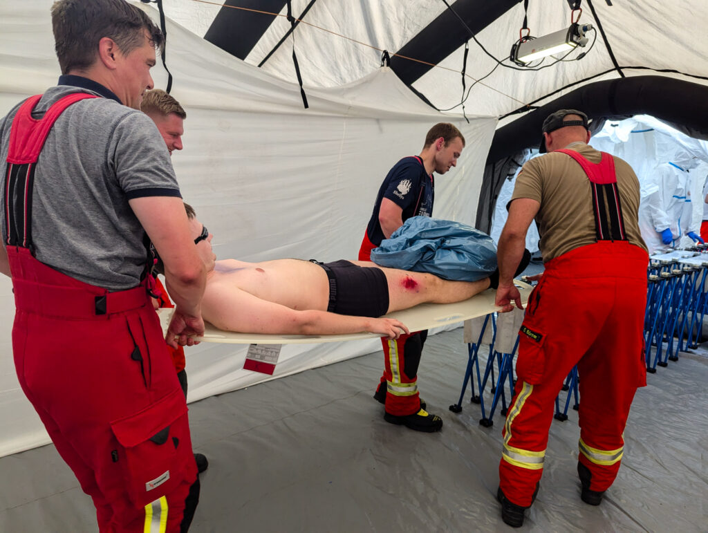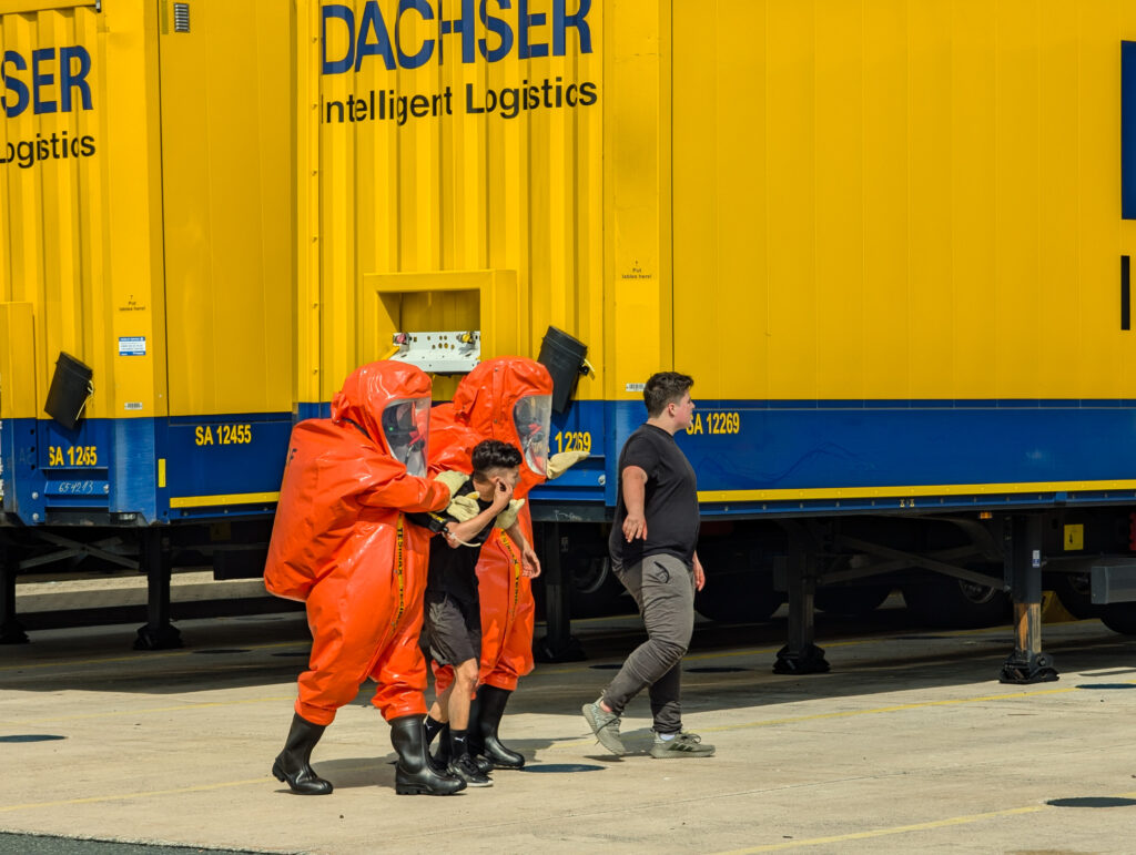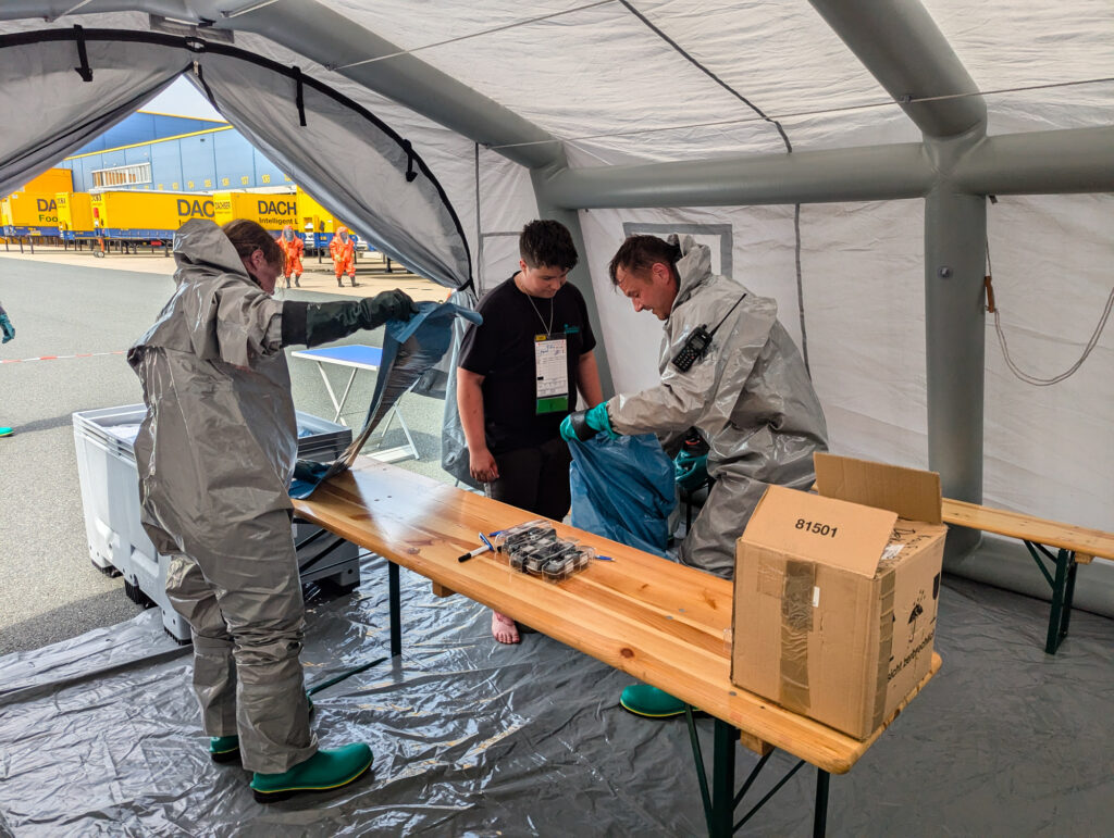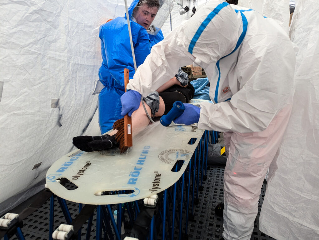 Da die Personen, so die Übungsannahme, mit Gefahrstoffen in Kontakt gekommen sein könnten, war eine direkte Übergabe an den Rettungsdienst zur weiteren Behandlung ausgeschlossen. Die Verletzten mussten vorher dekontaminiert werden, um eine Verschleppung der gefährlichen Stoffe zu verhindern und die Sicherheit des medizinischen Personals zu gewährleisten.