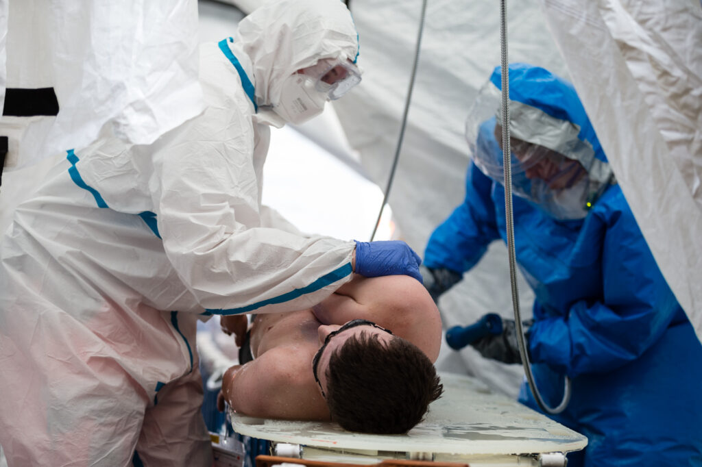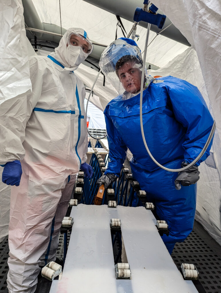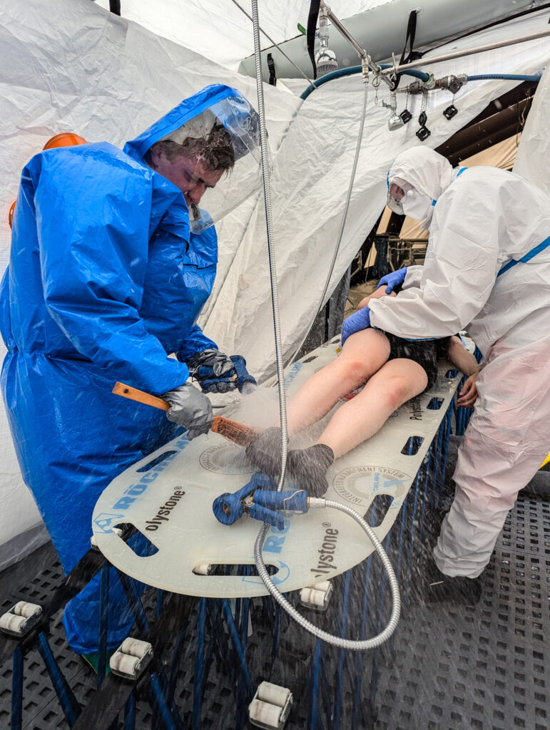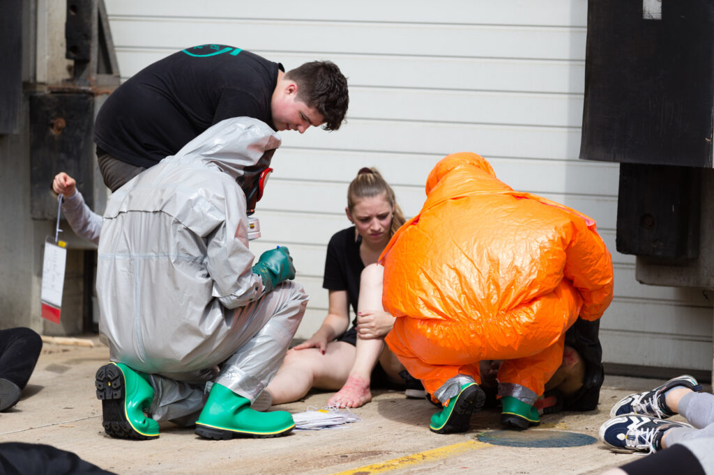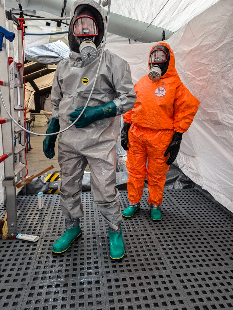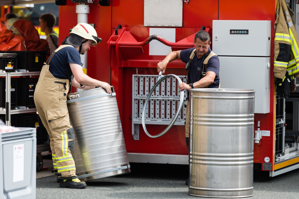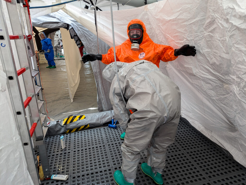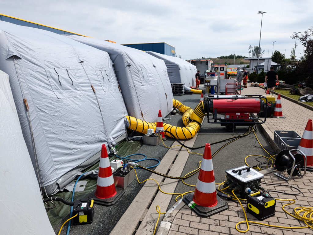 Da die Personen, so die Übungsannahme, mit Gefahrstoffen in Kontakt gekommen sein könnten, war eine direkte Übergabe an den Rettungsdienst zur weiteren Behandlung ausgeschlossen. Die Verletzten mussten vorher dekontaminiert werden, um eine Verschleppung der gefährlichen Stoffe zu verhindern und die Sicherheit des medizinischen Personals zu gewährleisten.