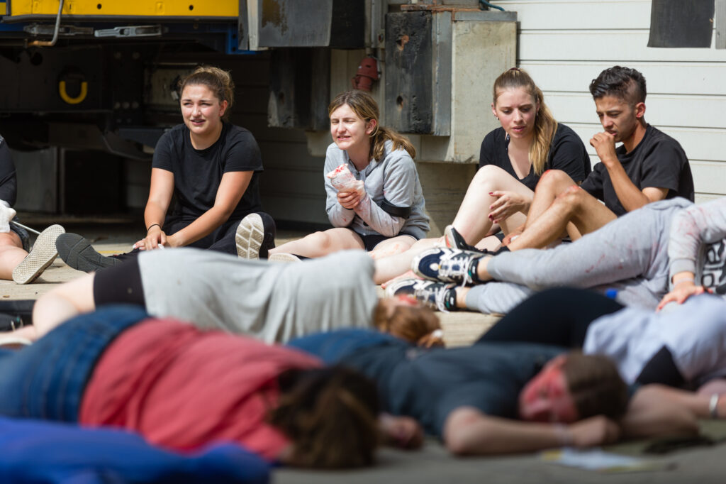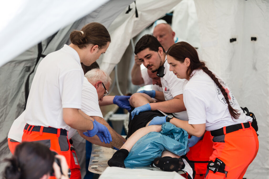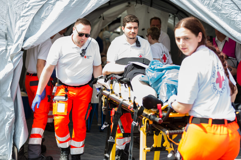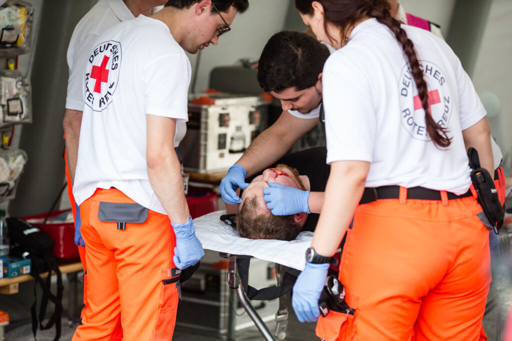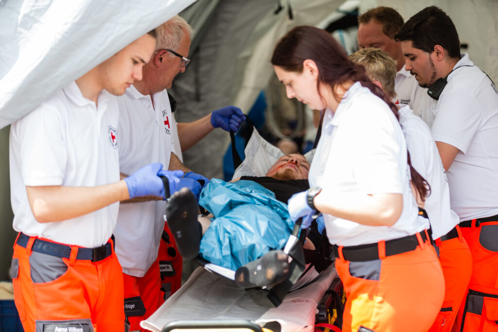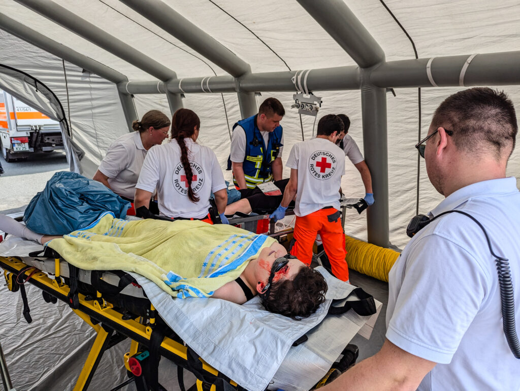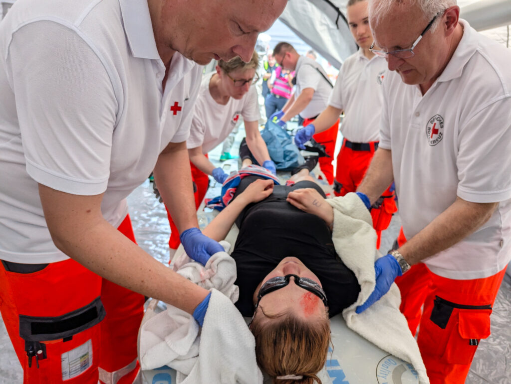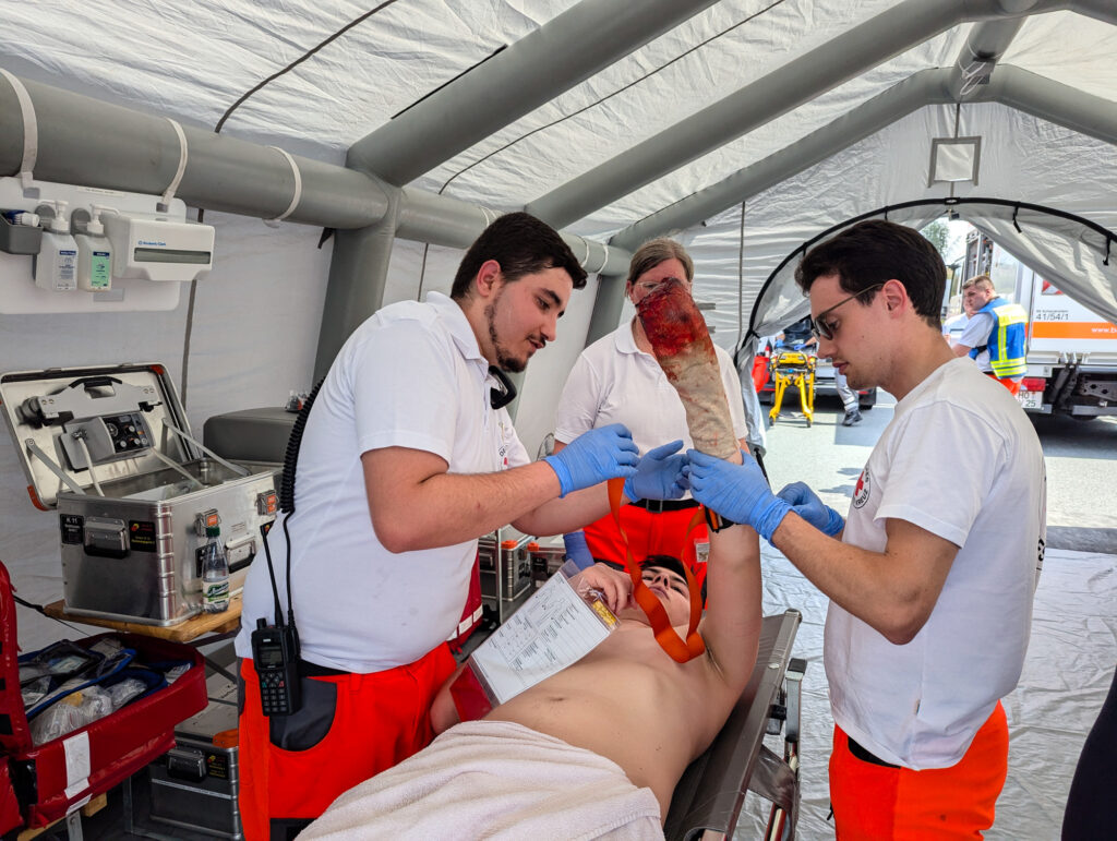 Das Team „Realistische Unfall- und Notfalldarstellung“ der DLRG Oberkotzau hatte 20 Verletztendarsteller mit verschiedenen simulierten Verletzungen präpariert, die im Gebäude auf ihre „Rettung“ warteten.