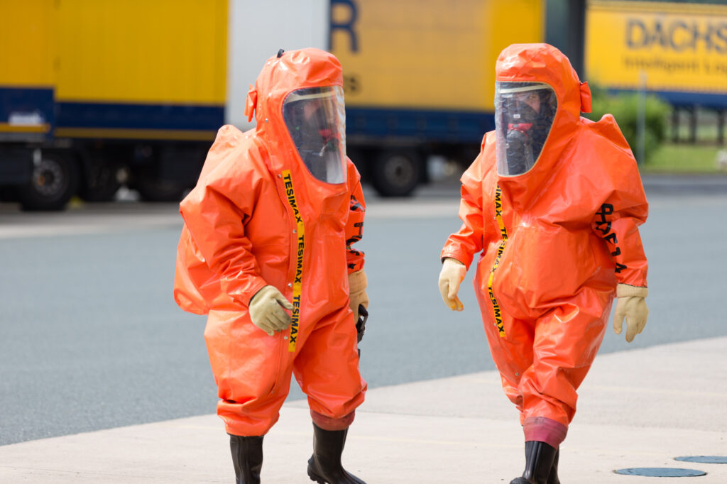 Dazu wird die Örtlichkeit in die Bereiche „sauber“ und „schmutzig“ eingeteilt. Der Gefahrenbereich wird abgesperrt und darf auschließlich von Einsatzkräften mit angelegter Sonderschutzausrüstung betreten werden. Am Übergang zum sauberen Bereich wird eine Schleuse aufgebaut, in der Mensch und Material zunächst dekontaminiert, also von Rückständen gefährlicher Stoffe befreit werden. Die Oberbekleidung einschließlich der Schutzbekleidung wird abgelegt und in Plastiksäcke verpackt. Es folgt eine Dusche mit Wasser, Bürste und ggf. Spezialseife.