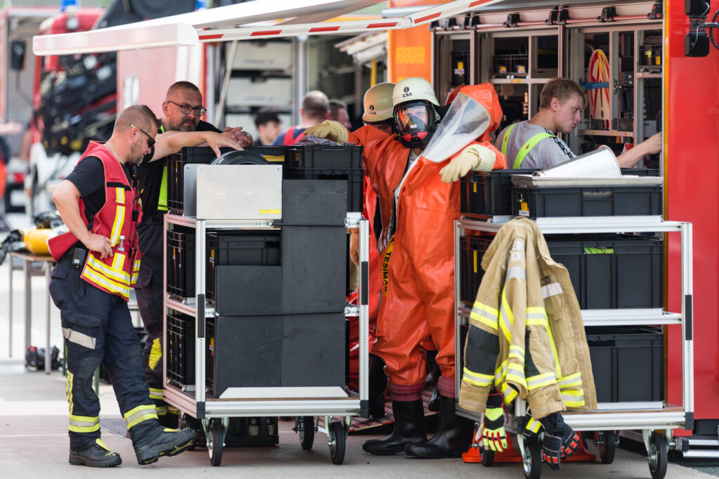 Ausgerüstet mit Chemikalienschutzanzügen und Pressluftatmern gingen die ersten Trupps in das Gebäude vor, um die Lage zu erkunden und die verletzten Personen ins Freie zu bringen.