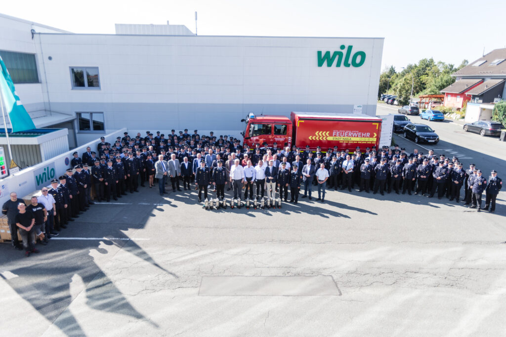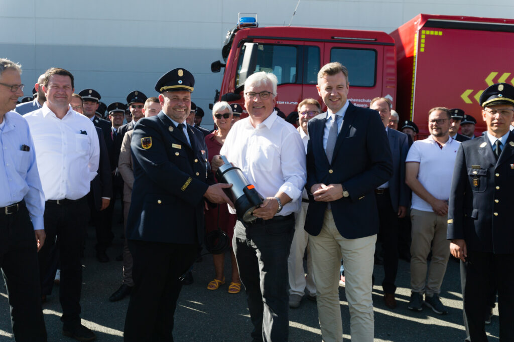 Am Samstag erfolgte am Hofer Standort die offizielle Übergabe durch Thomas Lang als Vertreter der Wilo Gruppe an die Kommandanten der Wehren. Landrat Dr. Oliver Bär und Kreisbrandrat Marco Kolbinger bedankten sich im Namen aller für das soziale Engagement und die großzügige Spende. Neben weiteren Vertretern der Wilo Gruppe waren außerdem zahlreiche Bürgermeister der Landkreiskommunen sowie die besonderen Feuerwehr-Führungsdienstgrade des Landkreises anwesend. Im Anschluß hatten alle Gäste die Gelegenheit, an einer Werksführung durch die Produktionshallen teilzunehmen.
