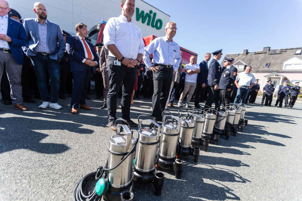 Umso größer war die Freude bei den Wehren im Landkreis darüber, dass sich die Firma Wilo zur Unterstützung der Sicherheit der Bürger und des Ehrenamts im Landkreis Hof entschieden hat, insgesamt 148 tragbare Schmutzwasserpumpen zu spenden, eine für jede Feuerwehr im Landkreis.