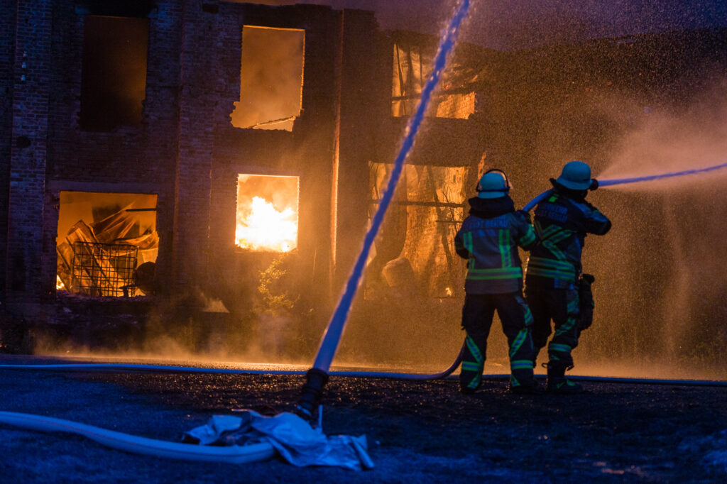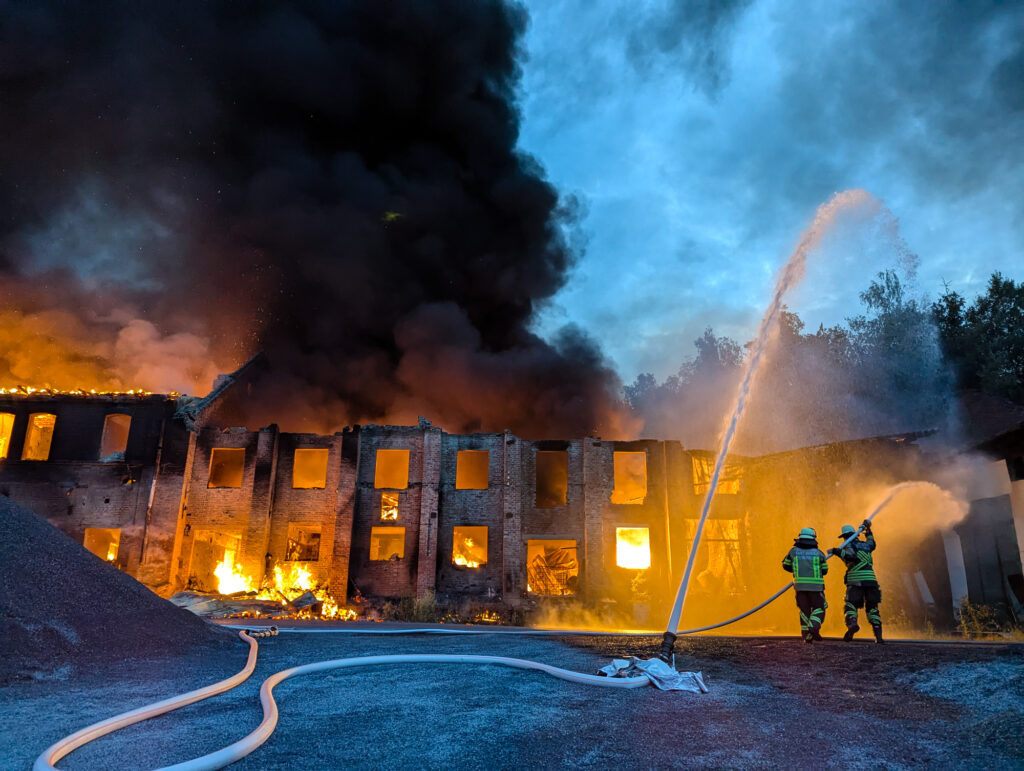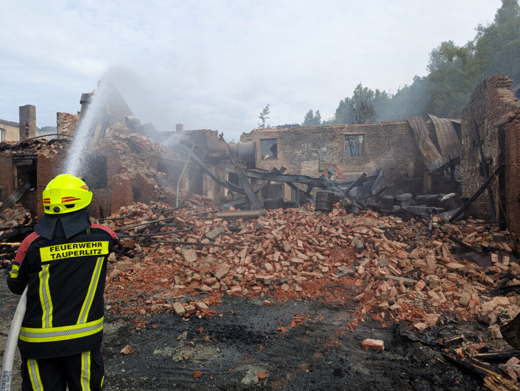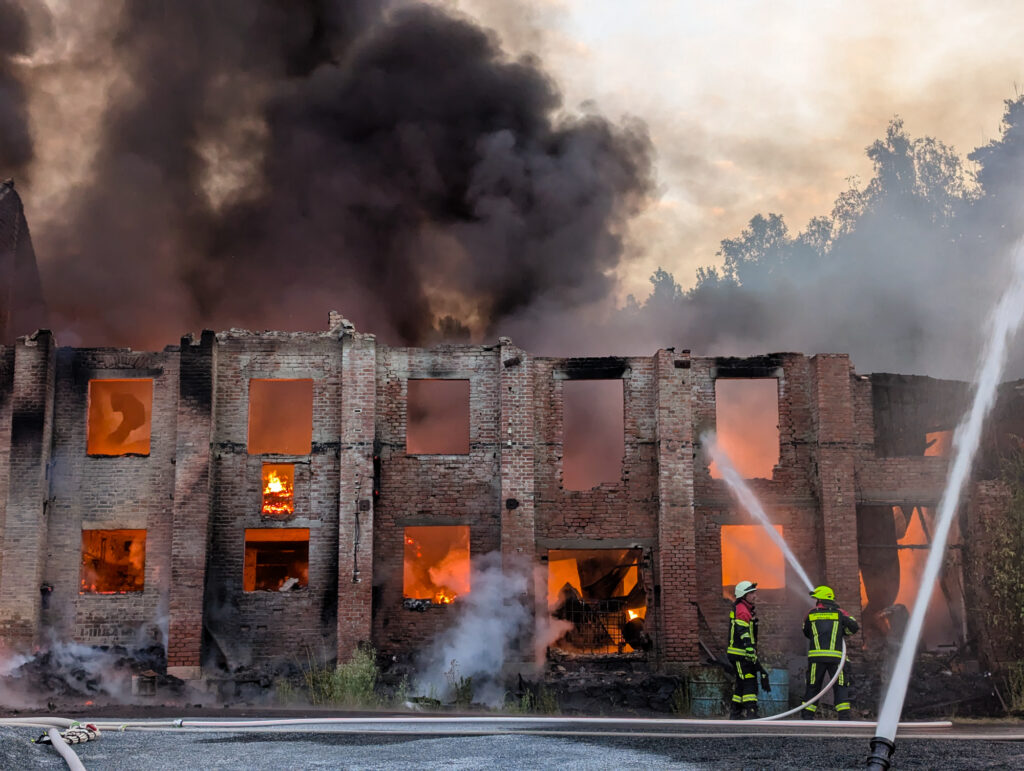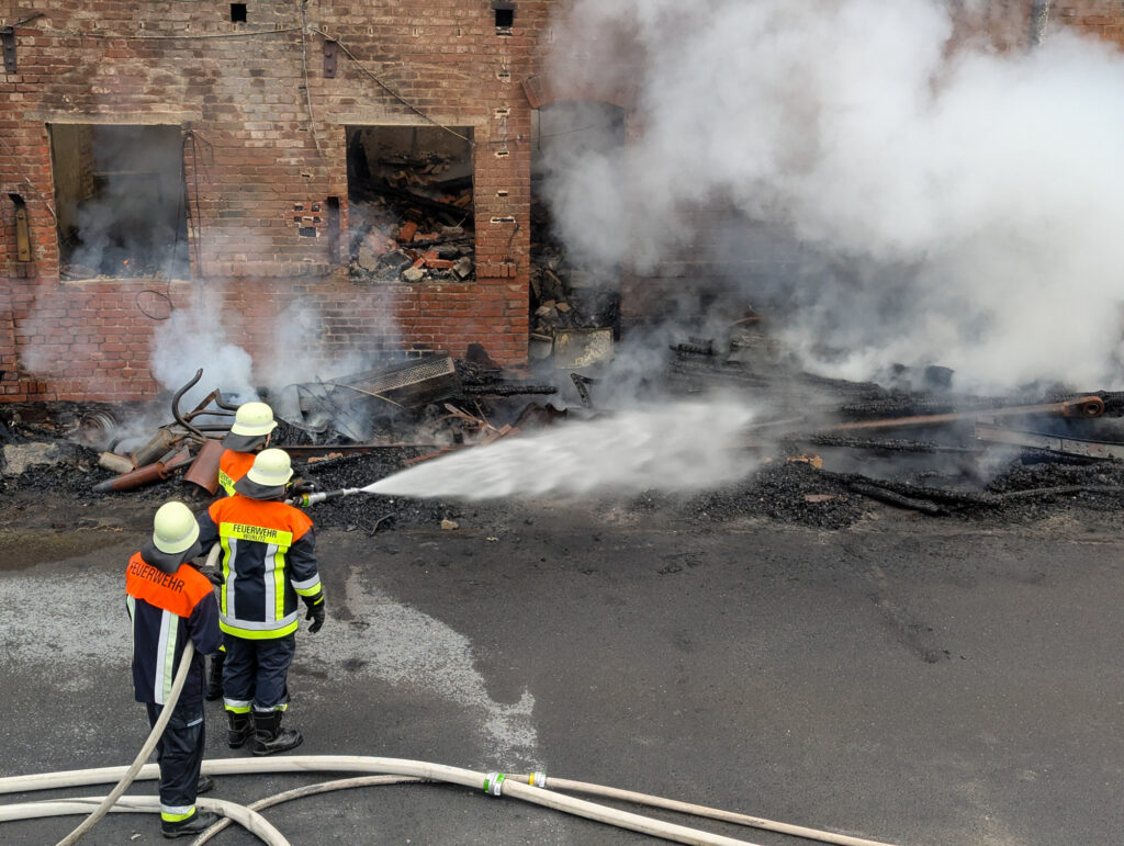 Beim Eintreffen der ersten Kräfte stand ein Gebäudekomplex bereits in Vollbrand, darunter auch eine Maschinenhalle mit mehreren untergestellten Fahrzeugen. Aus einem brennenden 5000-Liter-Kraftstofftank im Gebäude trat eine heftige Stichflamme aus.