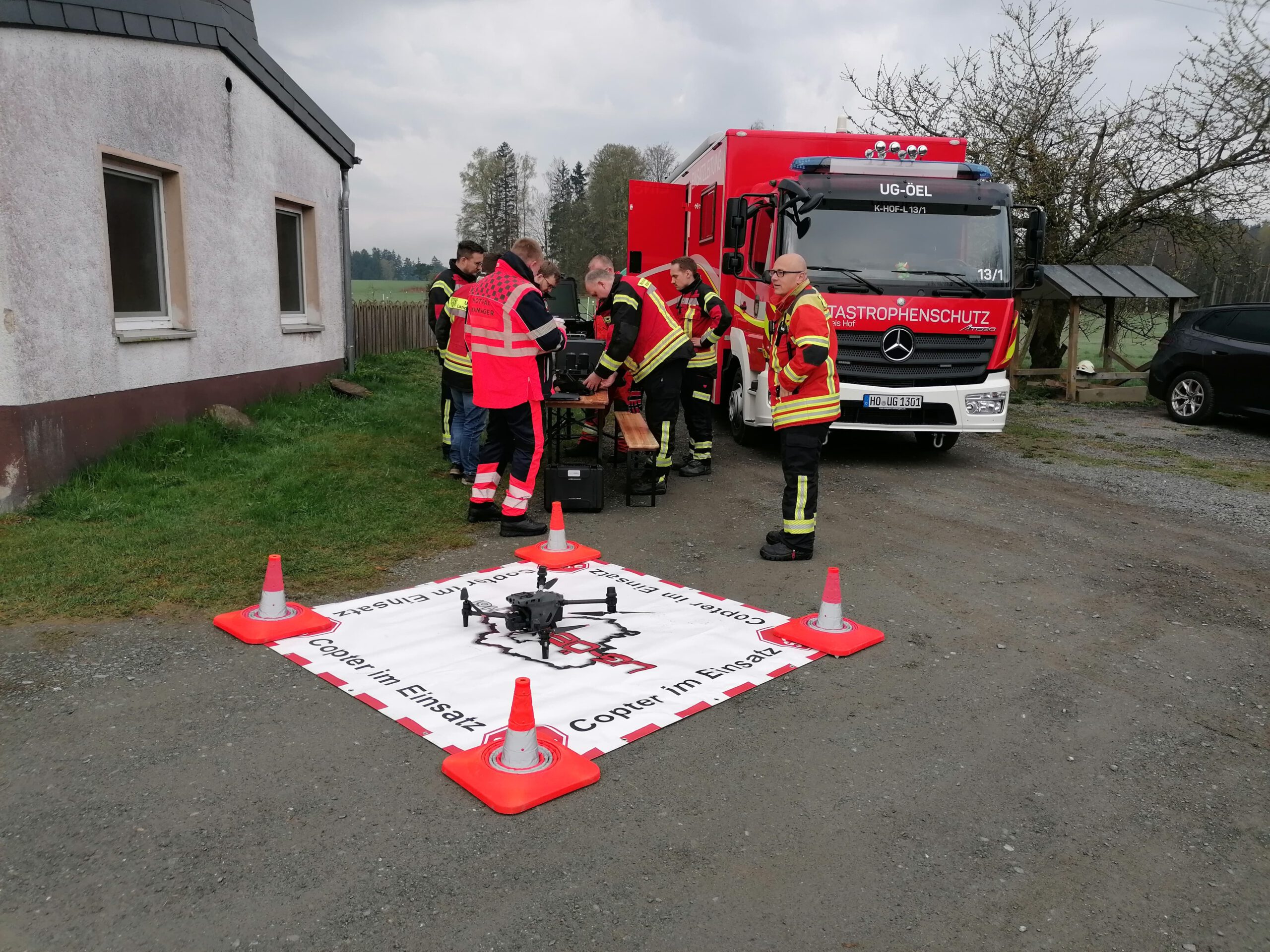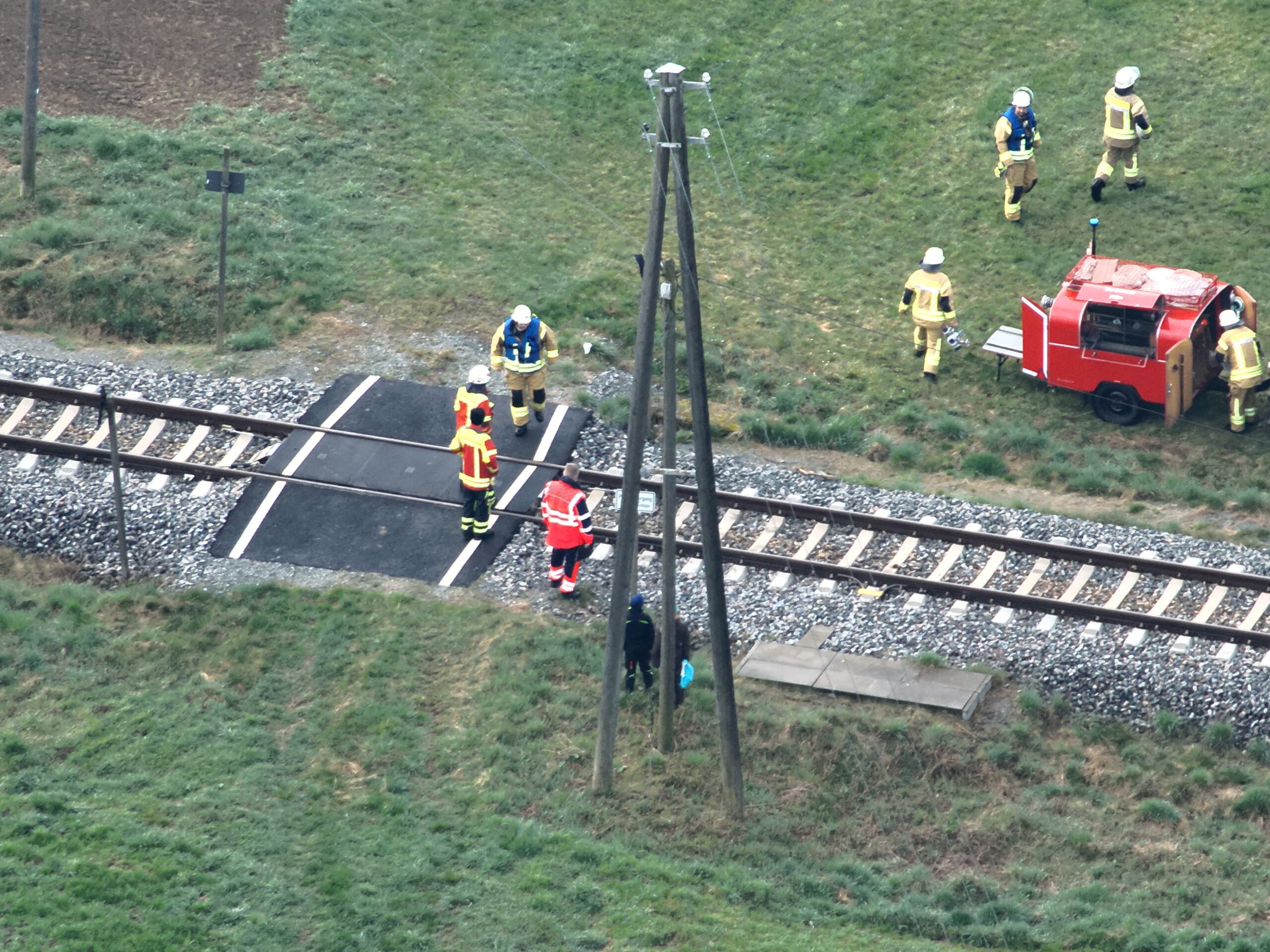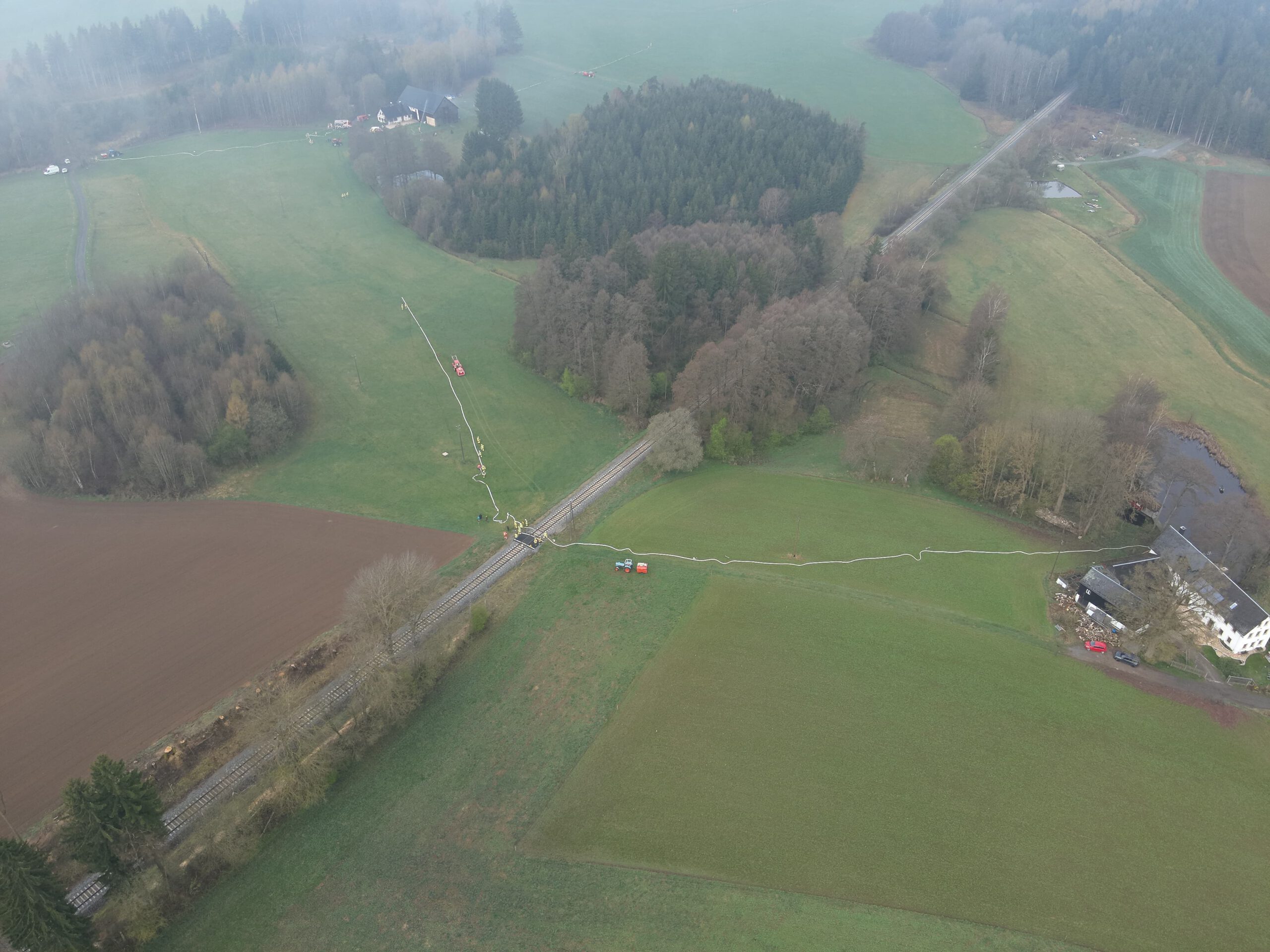 Am Sonntag, 19.04.2026 fand im Münchberger Ortsteil Hildbrandsgrün – Wäldlein für die Feuerwehren Hildbrandsgrün, Poppenreuth-Plösen, Unfriedsdorf, Wüstenselbitz-Burkersreuth, Dreschersreuth und Ottengrün eine Einsatzübung statt. Ebenfalls an der Einsatzstelle war ein Notfallmanager der Deutschen Bahn sowie Kreisbrandinspektor Reinhard Schneider und Kreisbrandmeister Oliver Heinold. Beobachtet wurde die Übung auch durch das Drohnenteam der Unterstützungsgruppe Örtliche Einsatzleitung.