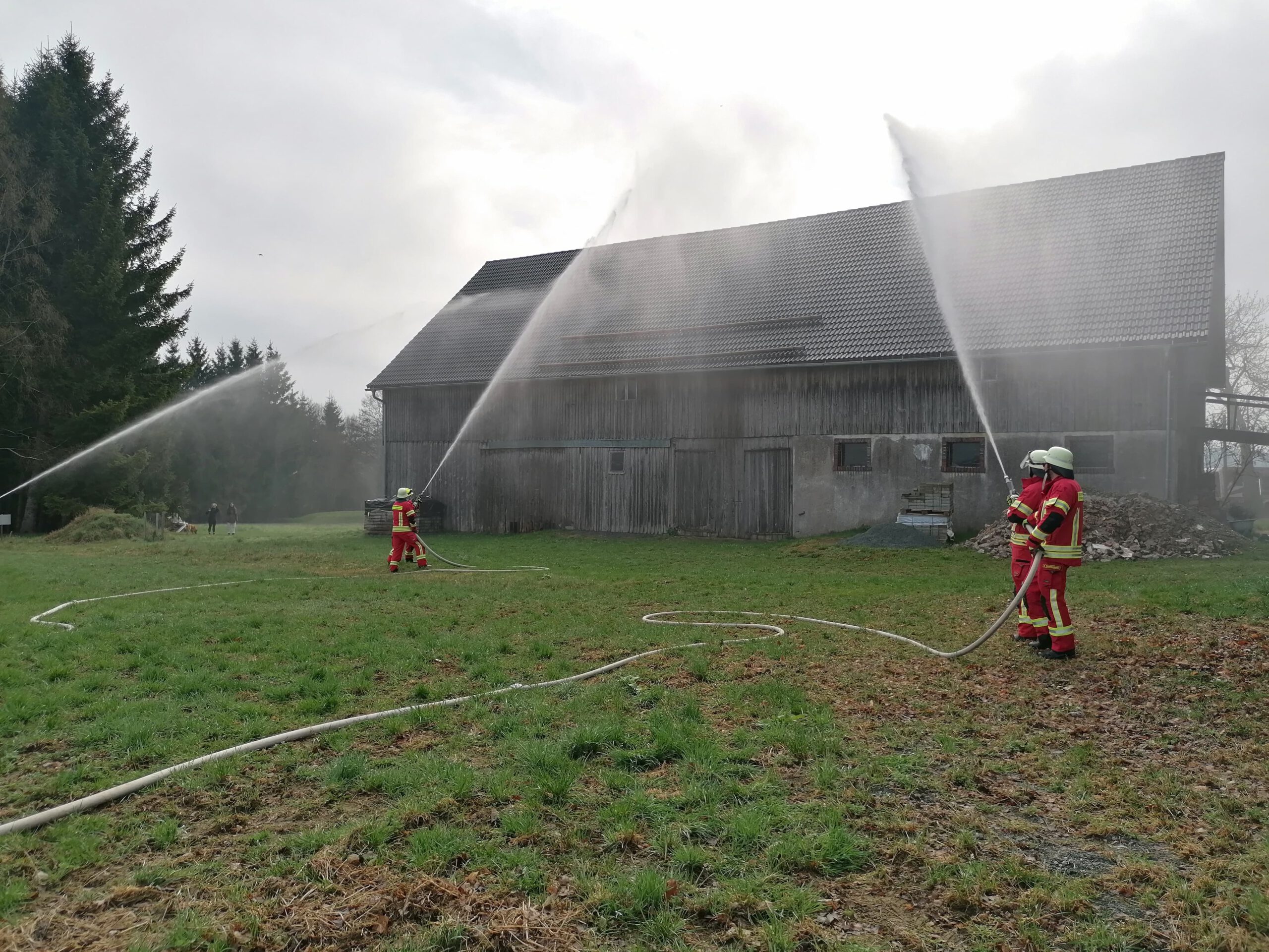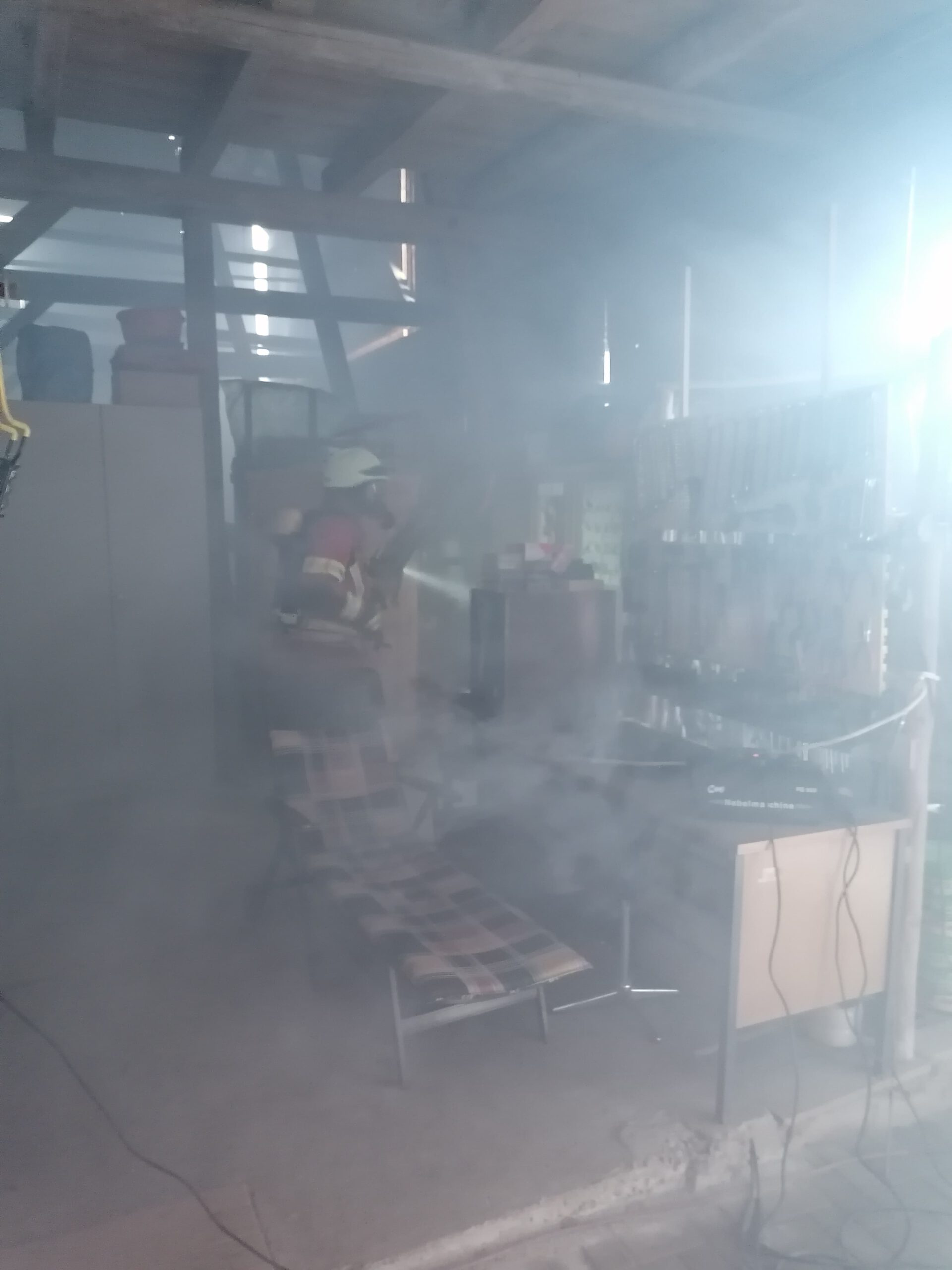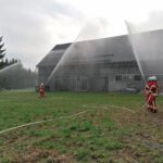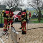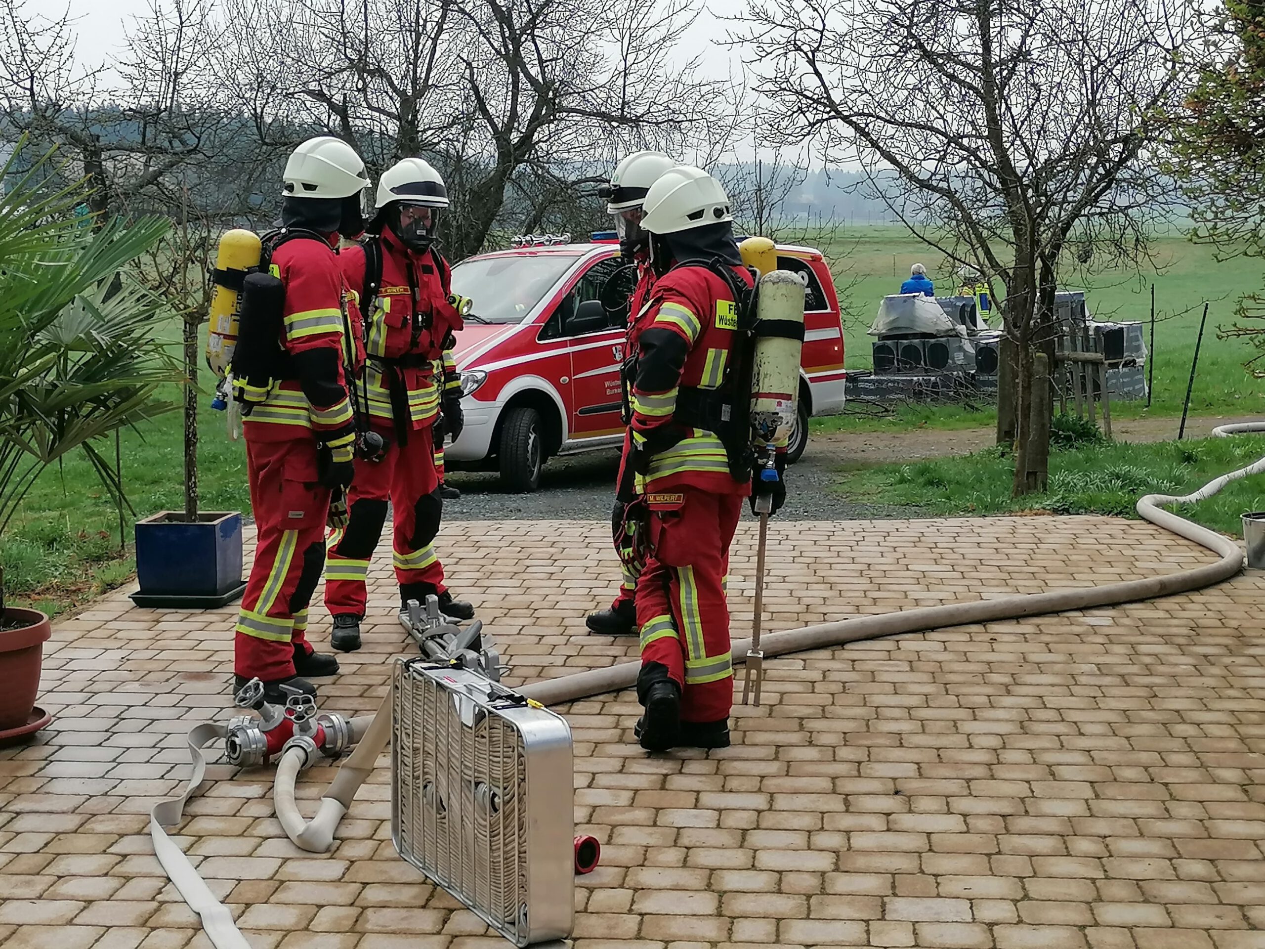 Während die Feuerwehr Hildbrandsgrün vom nahe gelegenen Hydranten aus eine Wasserversorgung aufbaute, rüsteten sich 2 Teams der Feuerwehr Wüstenselbitz-Burkersreuthmit schwerem Atemschutz aus, um mit der Personensuche zu beginnen.