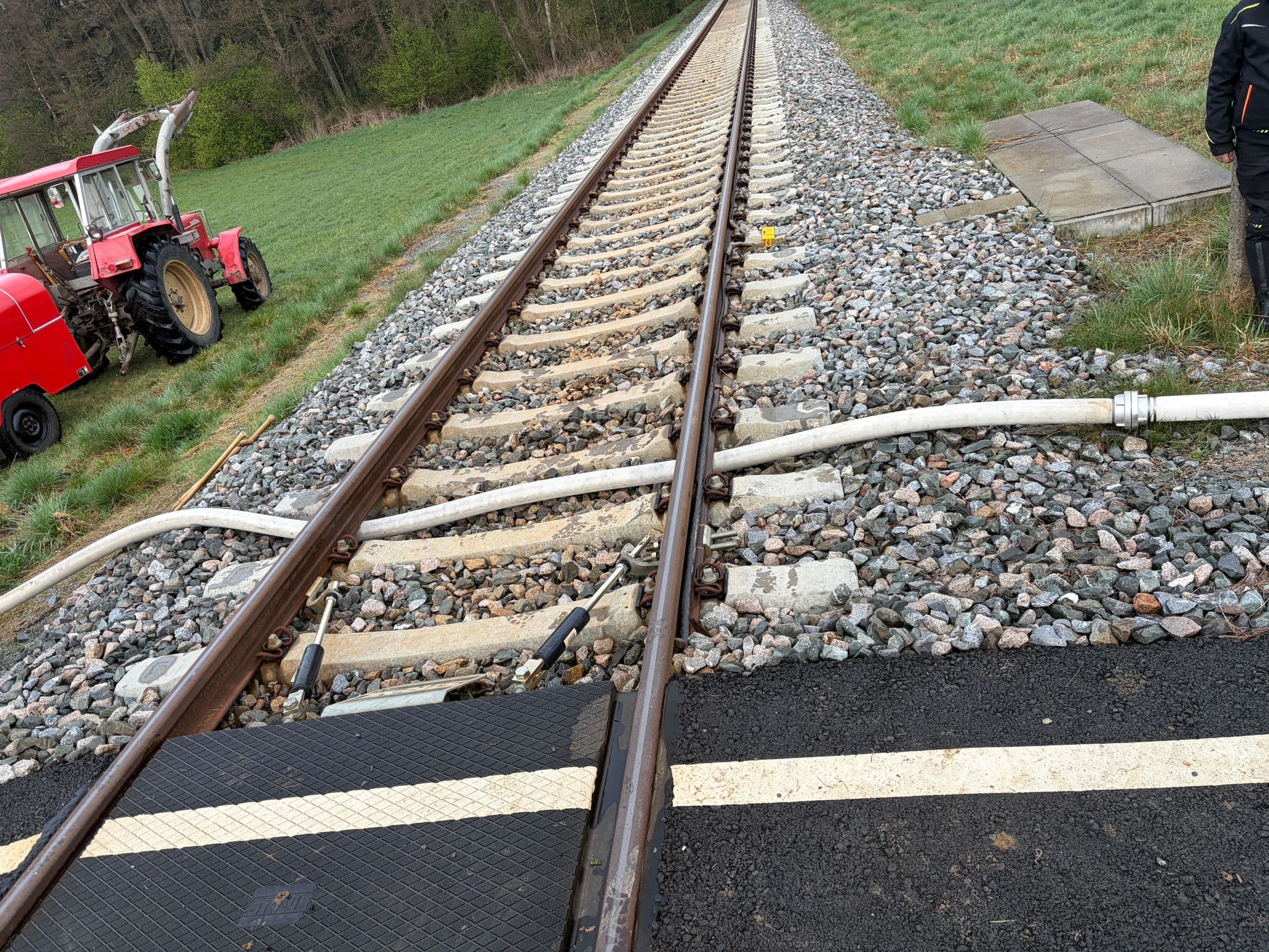 Zeitgleich bauten die Feuerwehren Unfriedsdorf und Poppenreuth-Plösen von einem ca. 400 m entfernten Teich eine Wasserförderung auf. Da diese Förderstrecke die Eisenbahnstrecke Münchberg-Helmbrechts kreuzte, war der Notfallmanager der Deutschen Bahn vor Ort. Er genehmigte, die Schlauchleitung unterhalb der Schienen im Schotterbett zu verlegen und stand im ständigen Kontakt mit den Zugführern.